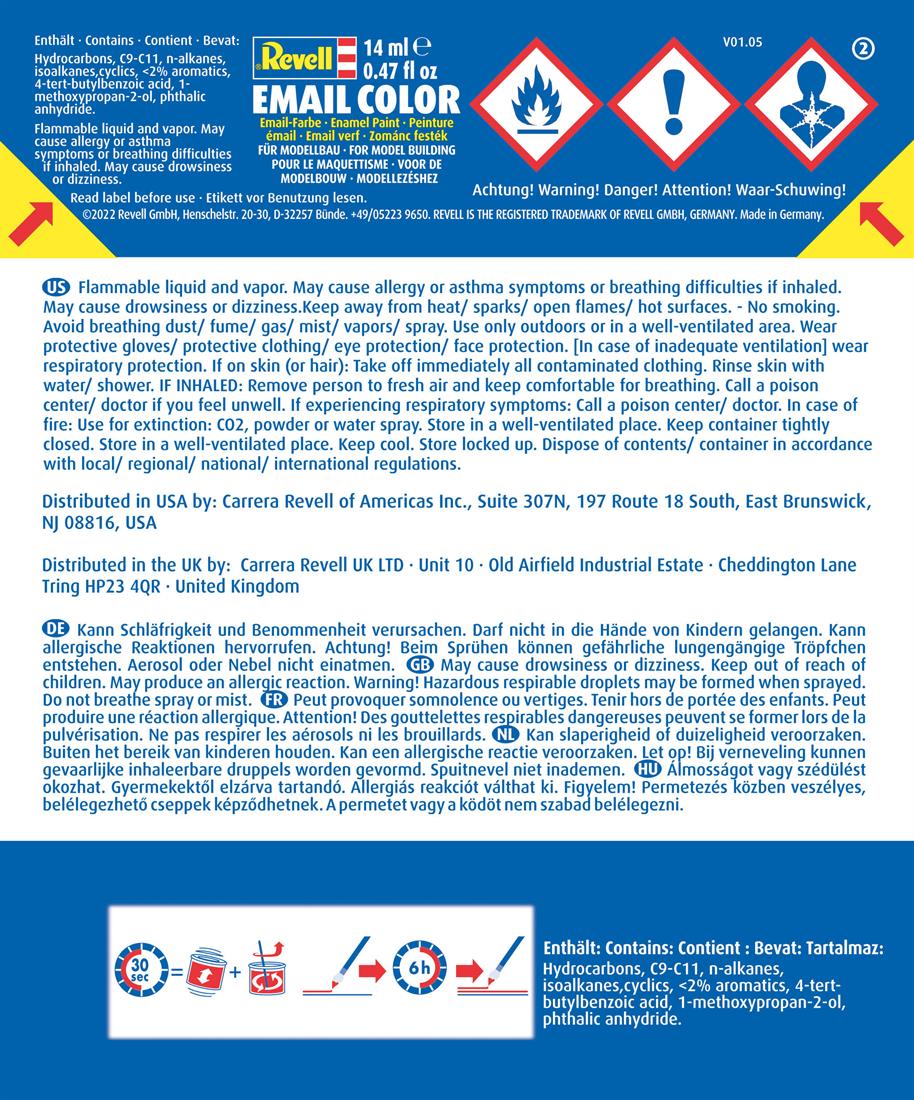 'Revell Color' ist ein Kunstharz-Emaillelack, der die Kunststoffoberfläche von Plastikmodellen nicht angreift. Aus der bei vielen Bastlern beliebten 14-ml-Lackdose können aber auch viele andere Materialien bemalt werden. Alle Farbtöne - außer Signalfarbe - sind untereinander mischbar und können mit 'Revell Color Mix' verdünnt werden. So kann der Lack nicht nur mit dem Pinsel, sondern auch mit einer Spritzpistole aufgebracht werden.