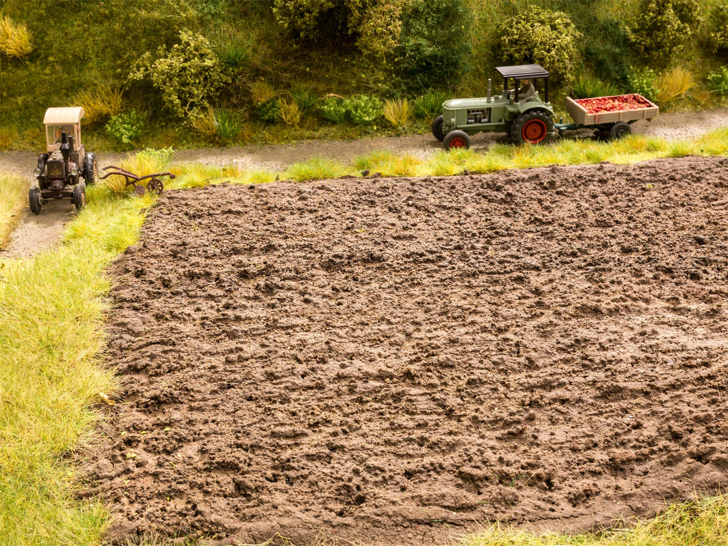 Die Natur+ Serie von NOCH umfasst einen naturrealistischen Acker aus dem bekannten Struktur-Hartschaum. Die Ackerkrumen sind vorbildgerecht aufgeworfen, als ob der Acker gerade eben erst gepflügt wurde. Zur Dekoration der Szenerie sind außerdem 10 Grasbüschel enthalten.