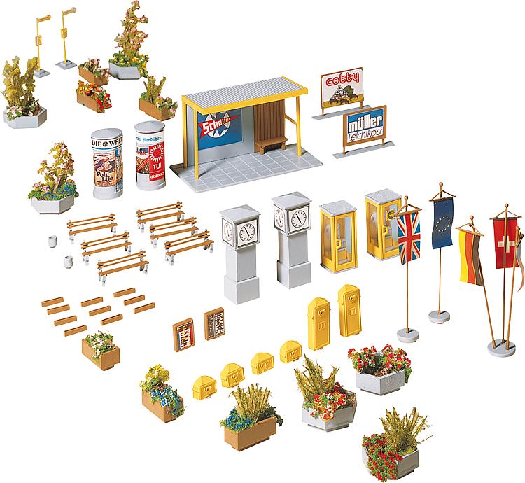 Telefonzellen, Litfaßsäulen, Briefkästen, Plakatwände, Uhren, Blumenschalen, Bus-Wartehäus­chen, Sitzbänke, Abfallkörbe, Zigarettenautomaten – erst diese, teilweise in mehrfacher Ausführung vorhandenen Teile, geben einer Stadt oder einem Dorf ein realistisches Erscheinungsbild.