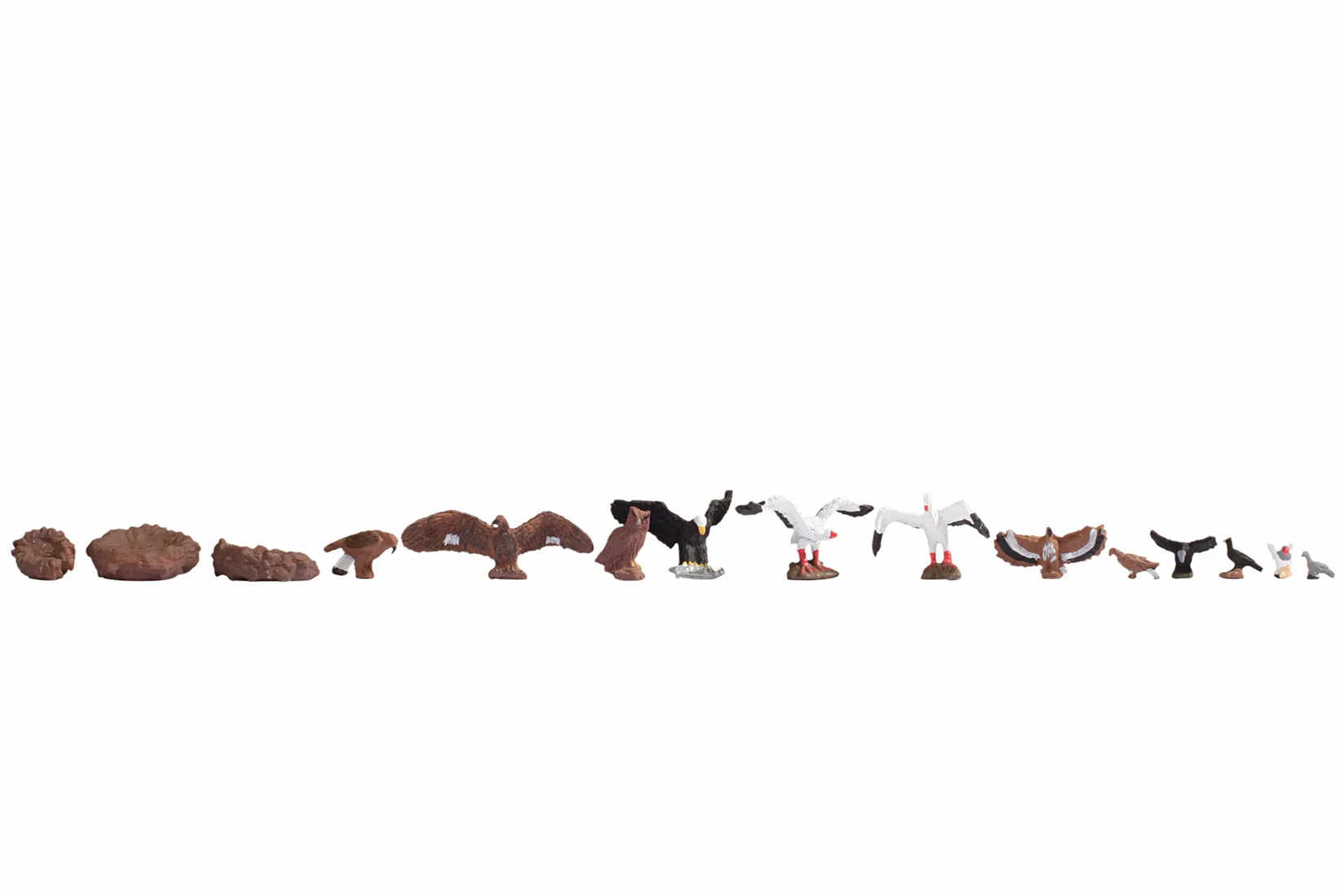 Neben den Raubvögeln wie Weisskopfadler Steinadler, Bussard und Eule befinden sich im Set auch Störche, Raben und Tauben. Weiterhin beinhaltet das 15-teiliege Set 3 Nester für die Adler und die Störche.