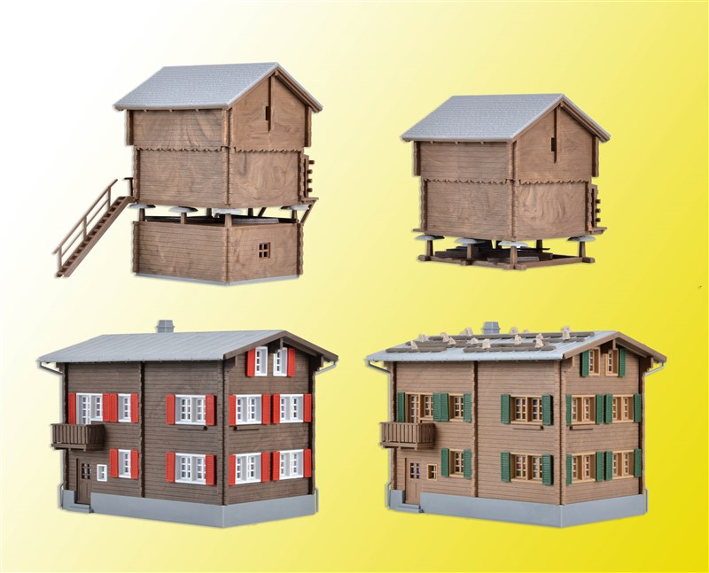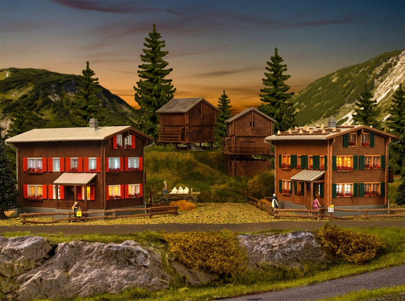 Die Landschaft um Davos ist von Bauten der Walser geprägt, die im 13. Jahrhundert aus dem Oberwallis zuzogen. Häufig sind dort solche Holzbauten anzutreffen, sowohl als typische Einzelhofsiedlung als auch ganze Dörfer. Das Set besteht aus 2 Wohnhäusern, einem Stall und Stadel. Dazu passt der Bahnhof Davos-Monstein Art. 39493. Mit Stecksystem.