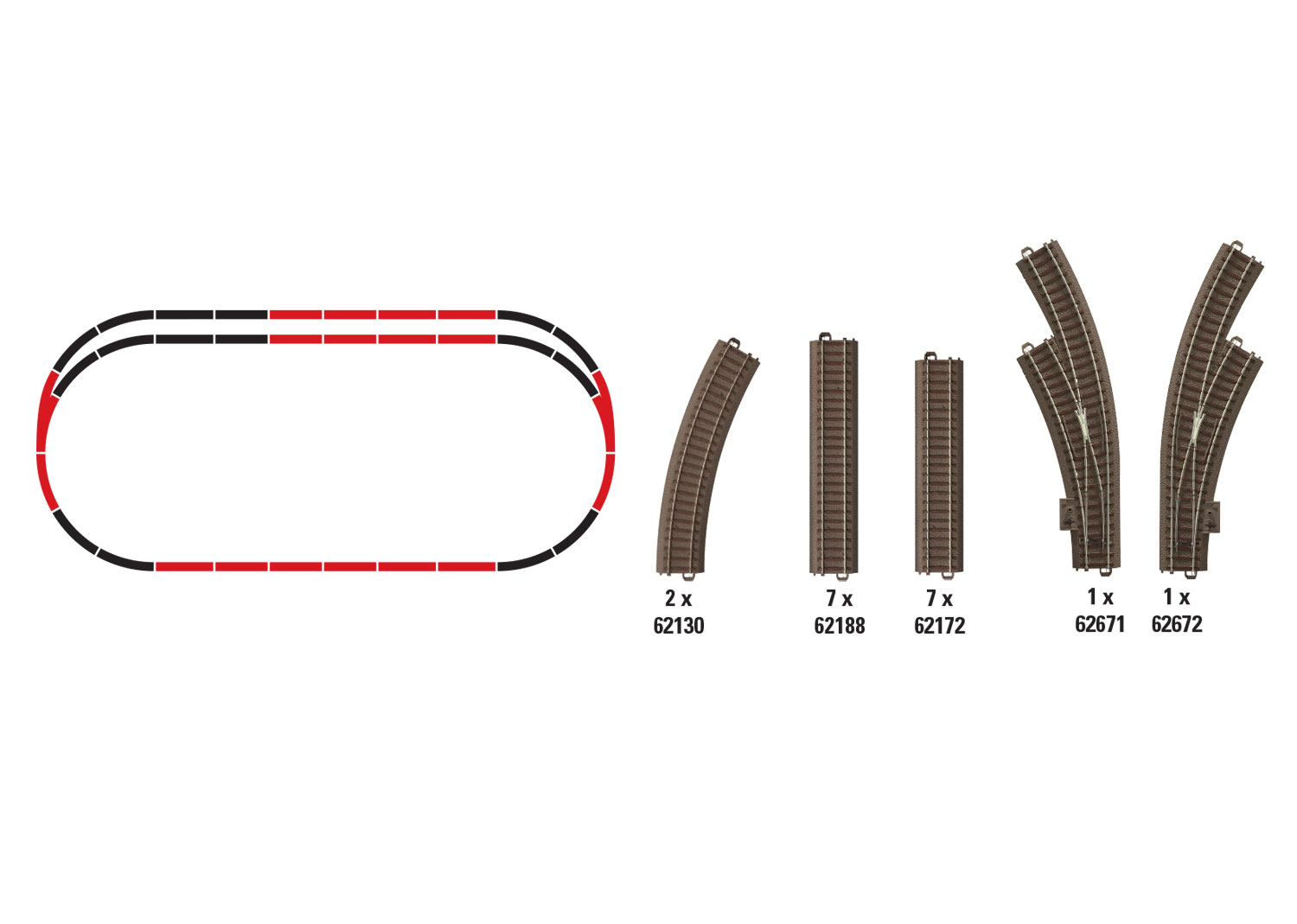 7 gerade Gleise 62188, 7 gerade Gleise 62172, 2 gebogene Gleise 62130, 1 Bogenweiche 62671, 1 Bogenweiche 62672 und Aufbauanleitung.