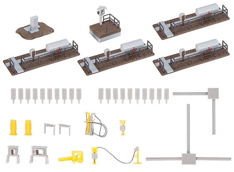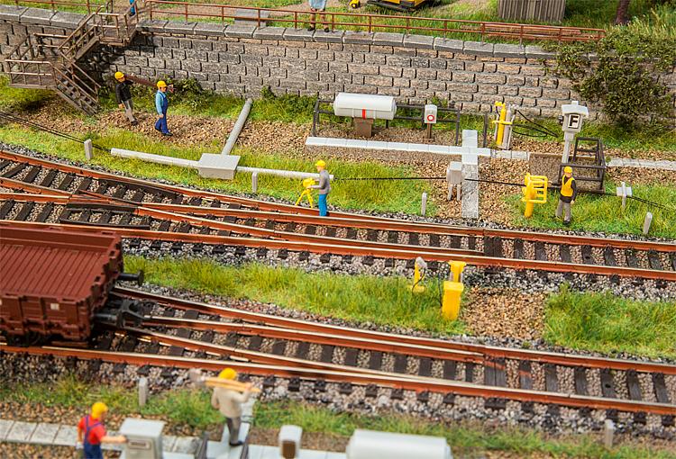 Set mit vier gasbetriebenen Weichenheizungen, bestehend aus Heizstäben, Kesseln und Geländern, Streckenfernsprecher, Schaltkasten, Hektometersteinen, einem Tremolo und weiteren Ausschmückungsteilen rund um das Gleis.