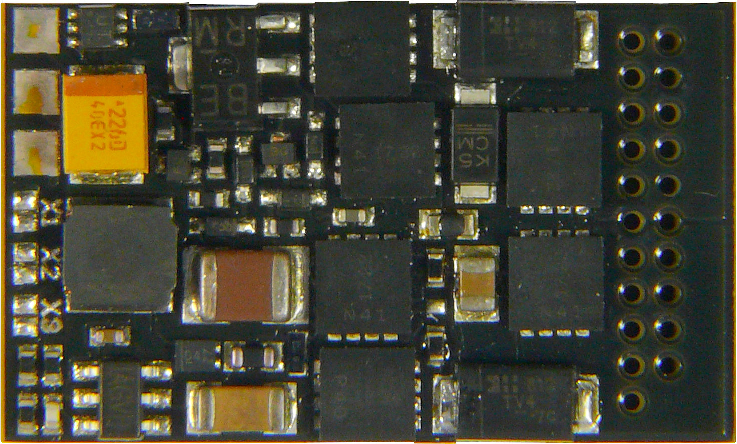 10 Funktionsausgänge, 2 Servo-Ausgänge, programmierbare Zweitadresse, DCC und MM, SUSI, RailCom, NMRA u. ZIMO function mapping, u.v.a. mit einstellbarer Niederspannung (CV#264)