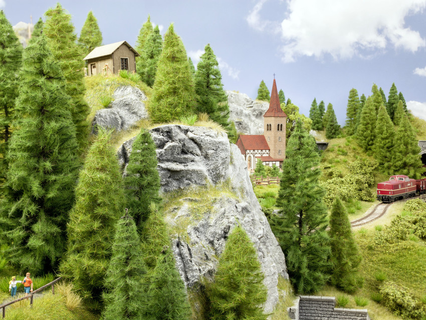 Die Kunststoff-Spritzlinge der Laubbäume sind handkoloriert und mit einem eigens dafür entwickelten, realistischen Flock belaubt. Die Tannen sind mit einem speziellen, naturgetreu wirkenden Nadelflock versehen.