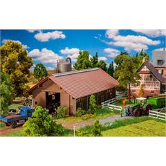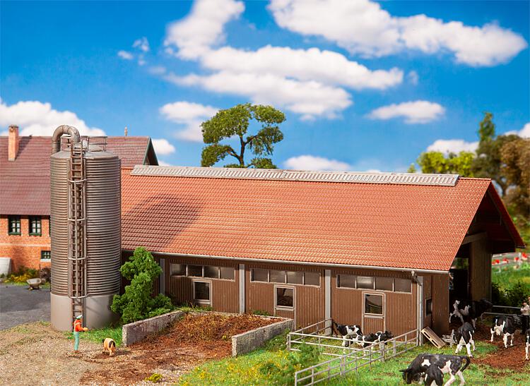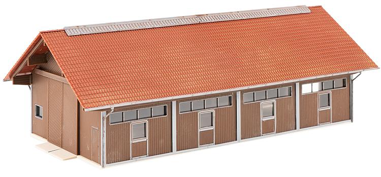 Für‘s Gehöft und Gestüt. Großzügige Stallung mit Satteldach, großen Schiebetoren an den Stirnseiten und je vier seitlichen Boxentüren. Die beiden Schiebetore lassen sich durch den Einbau der Torantriebs-Einheit, Art. 180624 (nicht beiliegend) öffnen. Modell für die Durchfahrt mit Car System-Fahrzeugen geeignet. Passende Ergänzung zum »Gestüt«, Art. 130542. Silo und Misthaufen nicht enthalten.