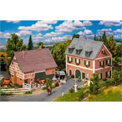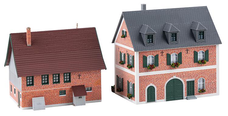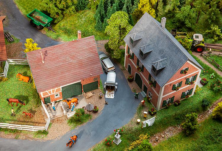 Ländliches Gestüt bestehend aus einem zweigeschossigen Haupthaus mit Satteldach und Dachgauben und einer großen Hofscheune mit Fachwerkobergeschoss. Durch das im Digitaldruck aufgebrachte Ziegelmauerwerk mit Zierankern und die grünen Tore und Fensterläden bilden die beiden Gebäude ein harmonisches Ensemble.