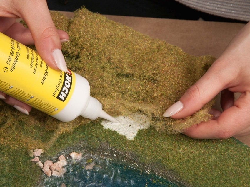Aufbringen: Dank des fein gesponnenen Trägermaterials kann die Foliage häufig ohne jeglichen Klebstoff fixiert werden (z. B. in Bäumen oder Büschen). Wenn die Foliage dennoch geklebt werden soll, empfehlen wir den Gras-Kleber (Art.-Nr. 61130) oder den Landschaftsbau-Kleber (Art.-Nr. 61133). Beide Kleber trocknen transparent aus.