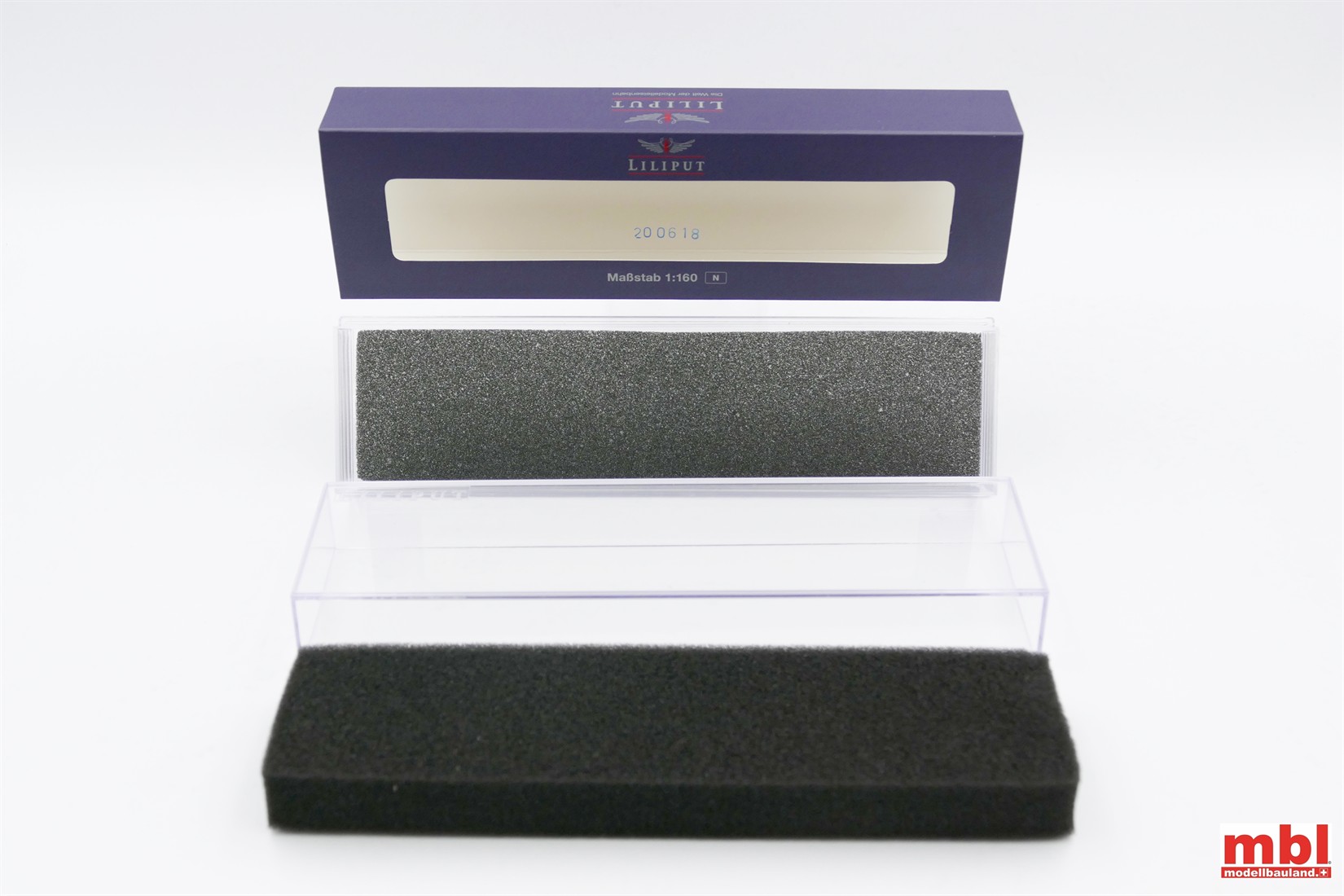 Klarsichtbox für N-Fahrzeuge lang, ca. 22,2 cm, mit Hülle, Universal-Inlay zum Zuschneiden. Universal-Klarsichtbox für längere Spur-N-Fahrzeuge. Mit Unterteil und Deckel sowie neutralem LILIPUT-Karton-Einschieber. Universal-Inlay aus schwarzem Hartschaum-Material, bestehend aus dünnem Bodenteil und dickem Oberteil zum Selbstzuschneiden.