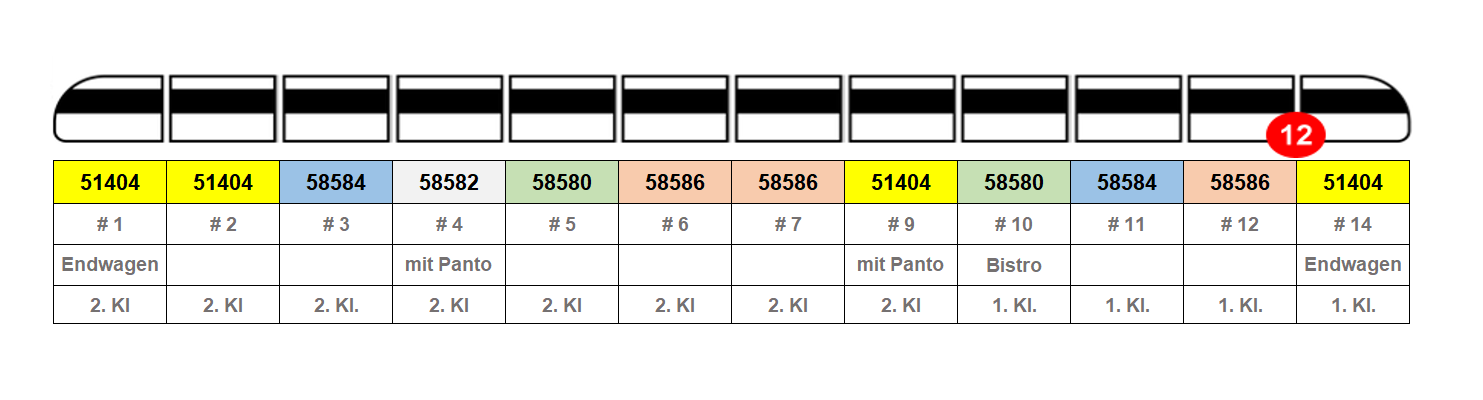 Ergänzungswagen zum PIKO ICE 4 der DB AG Ep. VI. Die Deutsche Bahn AG beauftragte 2011 Siemens Mobility mit dem Bau von bis zu 300 neuen Hochgeschwindigkeitszügen für den Einsatz in Deutschland, Österreich und der Schweiz. Die neuen Triebzüge der BR 412/812, die gemeinsam von Siemens und Bombardier entwickelt werden, werden über mehrere Wagen, sogenannte Powercars, angetrieben. Die Zugkonfiguration sieht hierbei verschiedene modular aufgebaute Einheiten von fünfteiligen bis zu 14teiligen Zügen vor. Durch dieses Konzept kann der Zug problemlos an die individuellen Vorgaben der Verkehrsunternehmen bei der gewünschten Beschleunigung, Geschwindigkeit und Zahl der Sitzplätze angepasst werden. Die DB hat bisher als Basiskonfiguration85 zwölf- und 45 siebenteilige Triebzüge bestellt, die aus antriebslosen End- bzw. Steuerwagen, angetriebenen Sitzwagen und Bordbistro sowie nichtangetriebenen Sitz-, Speise- und Servicewagen bestehen.Der siebenteilige Triebzug besitzt drei angetriebenen Wagen und bietet 456 Sitzplätze auf einer Länge von 200 Metern. Ein zwölfteiliger Triebzug verfügt über sechs angetriebene Wagen und 830 Sitzplätze auf einer Länge von 346 Metern. Die Höchstgeschwindigkeit beträgt mit 250 km/h. Die äußere Form wurde an die bestehende ICE-Flotte angelehnt und weiterentwickelt. Seit Dezember 2017 werden die ersten Züge im Regelbetrieb auf den Linien Hamburg–Würzburg, Stuttgart–München und Hamburg–Berlin–München eingesetzt.