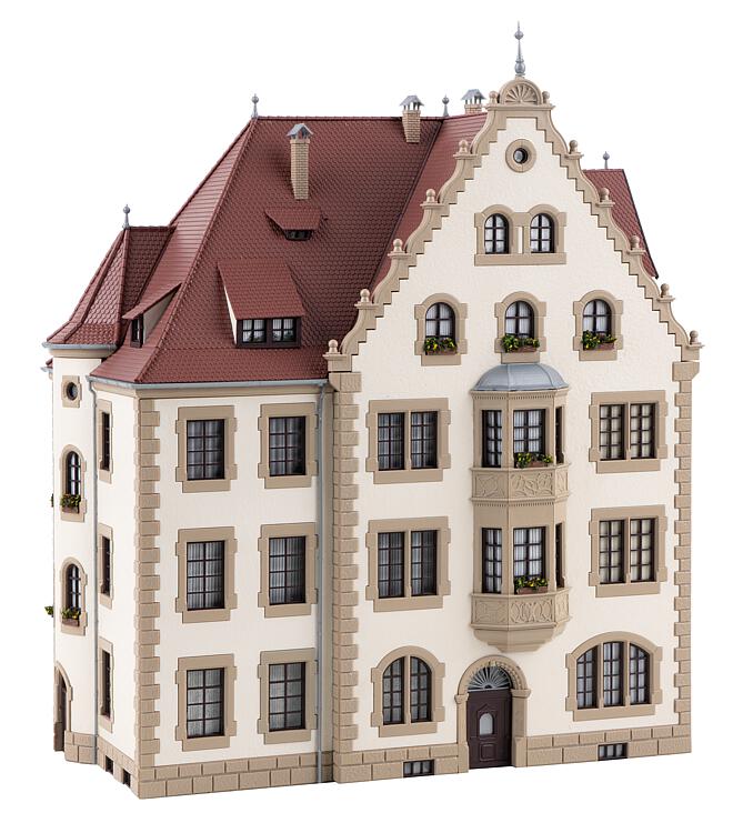 Repräsentatives, dreigeschossiges Gebäudemodell mit aufwändig gestalteten Fassadenelementen, wie gemauerte Fenstereinfassungen, Treppengiebel und Wappenbild sowie einem Fachwerk-Giebelhäuschen.