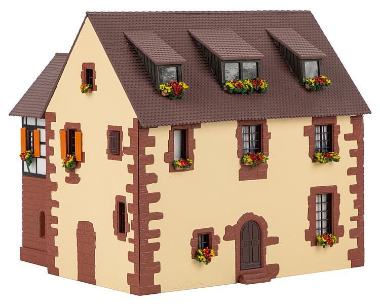 Zweigeschossiges Mühlenanwesen mit Eckquaderung und im Putz freigelegten Fenster- und Türgewänden aus behauenem Naturstein sowie einem traufseitigen Fachwerkanbau mit steinsichtigem Erdgeschoss. Am Modell ist sowohl die ober- als auch die tiefschlächtige Anbringung des giebelseitigen Wasserrads möglich, sodass eine Gestaltung des Wasserflusses freigestellt bleibt. Ausgediente Mühlsteine dienen zur Dekoration der Stirnfassade. Das Mühlrad kann optional mit dem »Synchron-Bastelmotor«, Art. 180629 (nicht beiliegend) angetrieben werden.