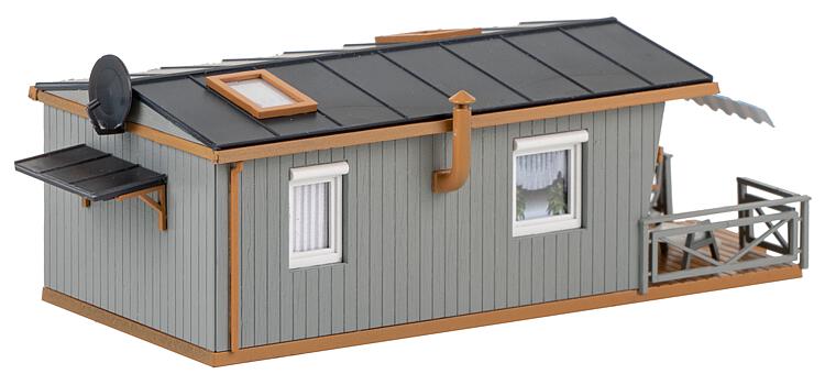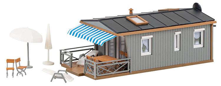 Mobile Architektur! Transportable Wohneinheit mit Veranda, Markise und einem Satteldach mit Dachfenstern für die Ausgestaltung einer Campingplatz-Szene. Passendes Zubehör, wie z. B. Sonnenschirme, Liegestühle und ein Tisch mit Gartenstühlen liegt dem Modell bei.