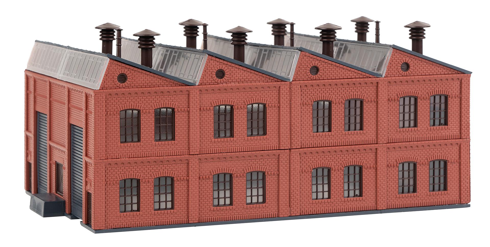 Zweigleisiges Ausbesserungswerk für die Instandhaltung Ihrer Schienenfahrzeuge. Zweigeschossige Richthalle mit roter Klinkersteinfassade, einem Sheddach mit Lüftungsrohren und beidseitigen Rolltoren für die Durchfahrtsmöglichkeit.