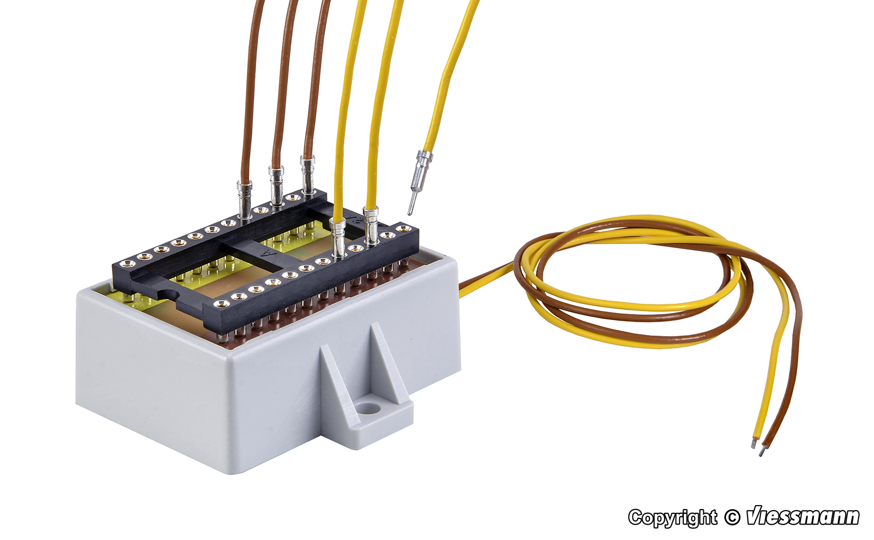 Das kompakte Modul für einfachen Anschluss und helle, flackerfreie LED-Beleuchtung. Die oben auf dem Modul gut zugängliche Steck-Verteilerleiste ermöglicht den bequemen lötfreien Anschluss von 12 Stromverbrauchern durch einfaches Einstecken ihrer Widerstände und Dioden in die Buchsen der Leiste – ideal für die Etageninnenbeleuchtung Art. 6045 – 6048. Mit Zuleitungskabel zum Lichttrafo.