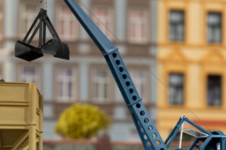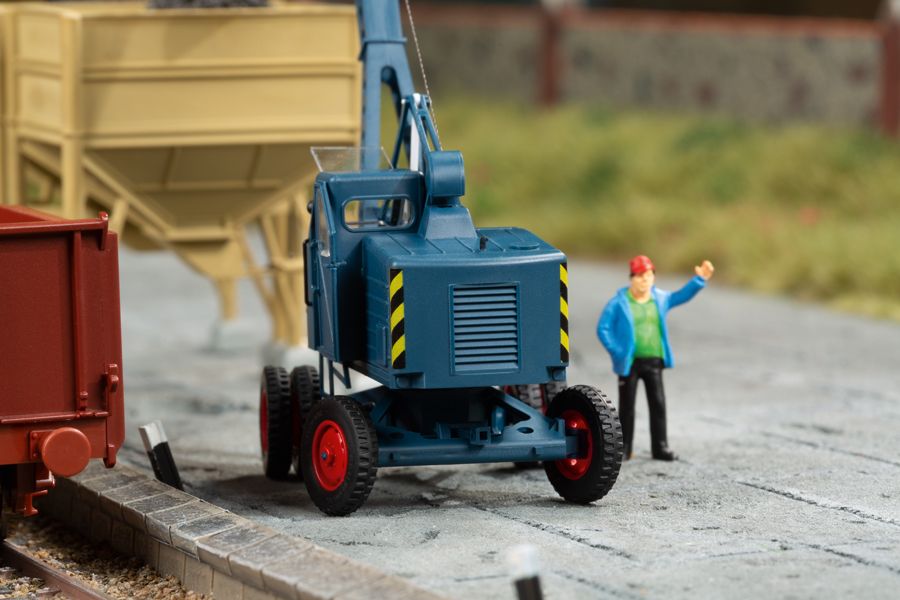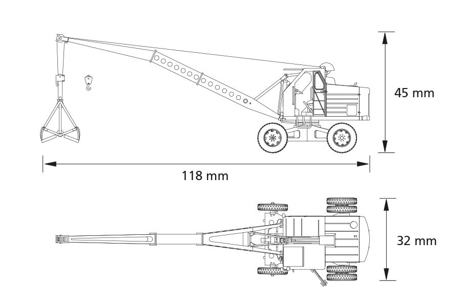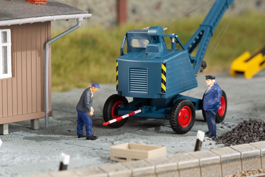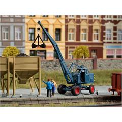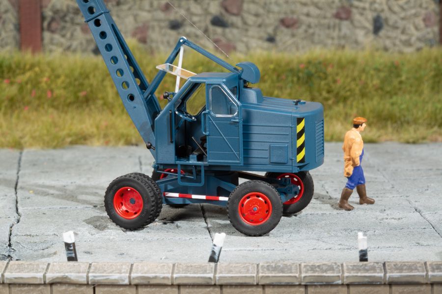 Der filigrane, detailliert bedruckte Bausatz gibt ein Vorbild in blaugrauer Lackierung wieder, passend zu unseren Thema Brennstoffhandel. Die Vorderachse ist lenkbar, der Aufbau um 360° drehbar und der Ausleger neigbar. Dieser ist, originalgetreu, durch ein Zwischenstück verlängert und kann wahlweise mit einem Haken, Zinken- oder Schalengreifer ausgestattet werden. Durch den längeren Ausleger kann er zur Beschickung der Trichtersilos der Kohleverladung (Art. 11 466) eingesetzt werden. Für die Verladung auf einen Niederbordwagen liegt eine Einfach-Bereifung für die Antriebsachse bei. Aufwändig bedruckt: Schleppstange und Warnbaken am Kranaufbau.