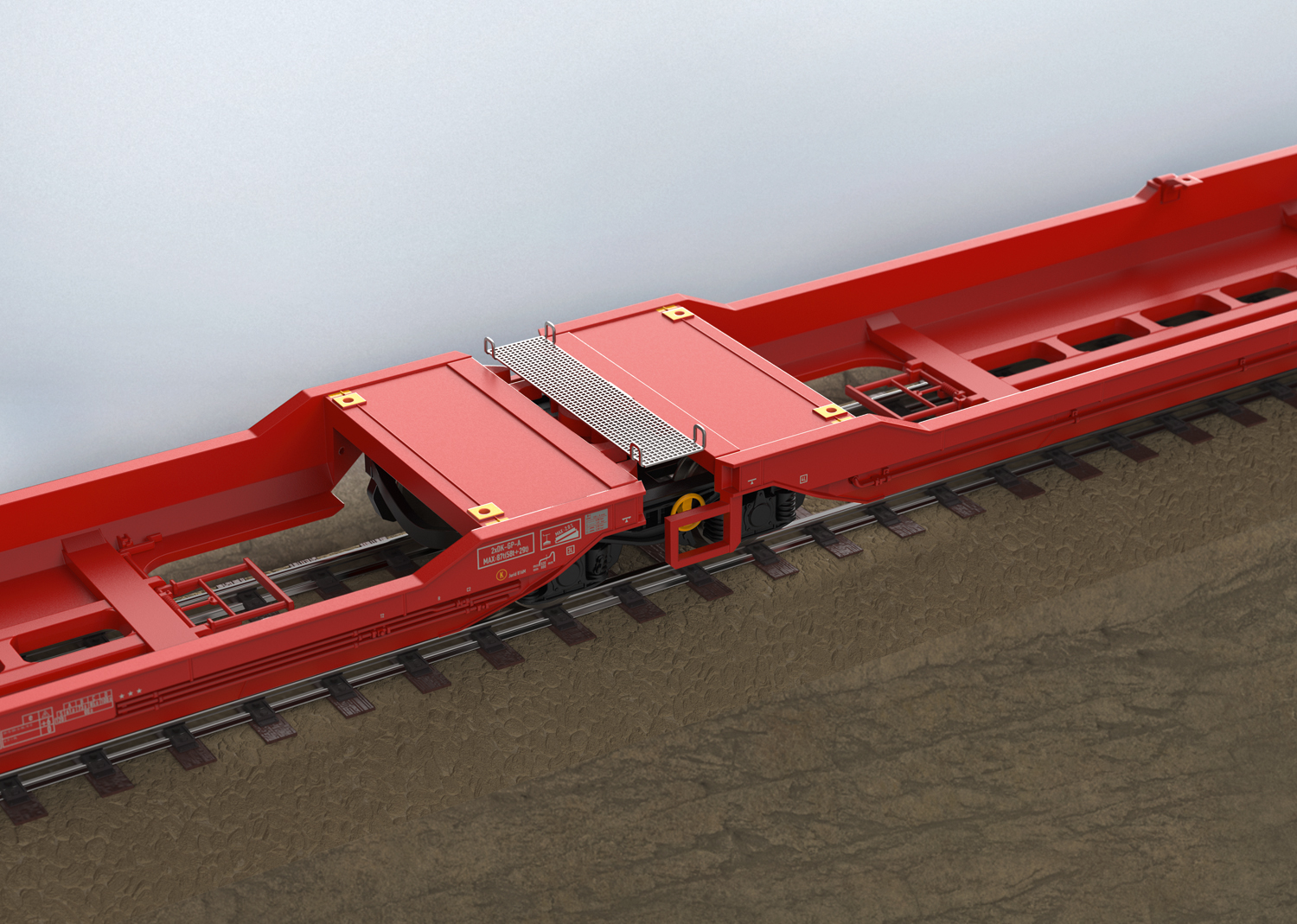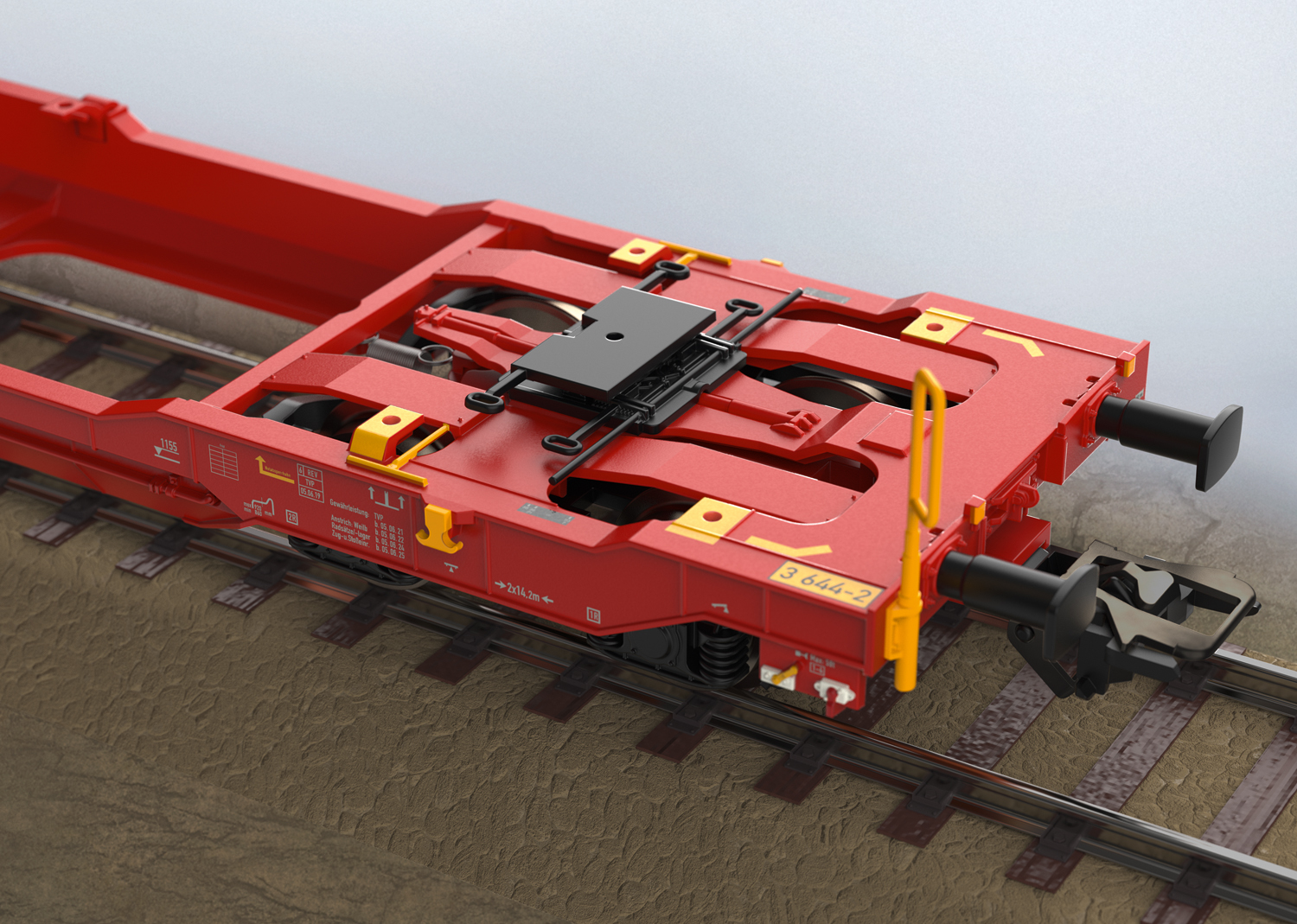 Beide Tragwagenhälften aus Metall, beweglich gelagert auf dem mittleren Drehgestell. Seitliche Klappriegel ab Werk montiert. Hochklappbar für den Transport von Containern oder Wechselbrücken. Viele separat angesetzte Details wie Übergangsrost, Tritte, Bremsleitungen und Haltestangen an den Wagenenden. Drehgestelle Bauart Y25. Pufferhöhe nach NEM. Aufnahme für Stützbock, Halterungen für Königszapfen in hoher und niedriger Ausführung, Rangiertritte und Luftkessel für die Wagenenden liegen als separat ansteckbare Teile bei. Beladen mit zwei Gardinenplanen-Sattelaufliegern der Spedition LKW Walter. Länge über Puffer ca. 39,3 cm.