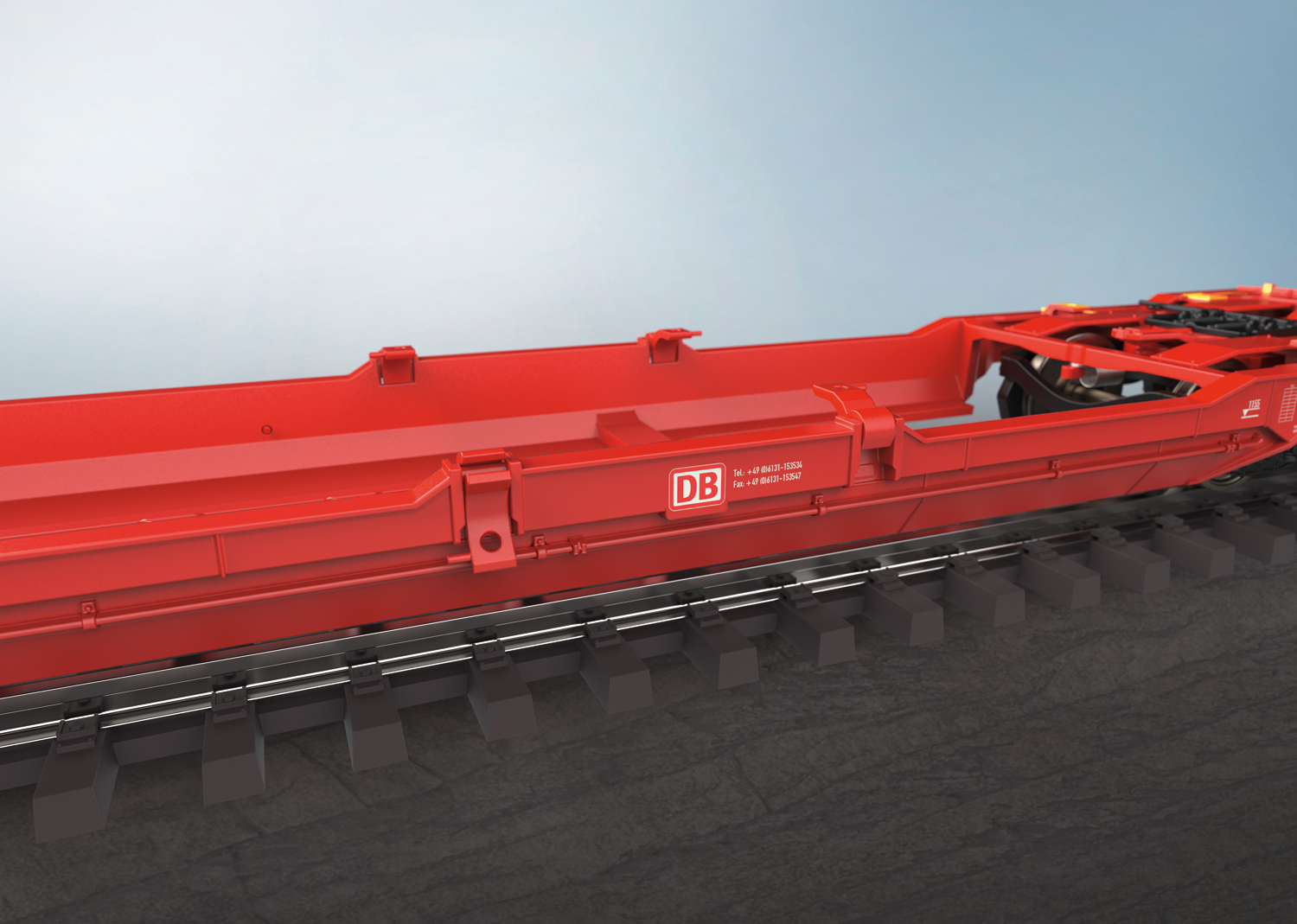 6-achsiger Doppel-Taschenwagen mit Gelenk der Bauart Sdggmrss 738 (T3000e) der Deutschen Bahn AG (DB AG). Moderner Tragwagen für den kombinierten Ladungsverkehr. Verkehrsrote Grundfarbgebung. Ausführung mit zwei seitlichen Klappriegeln. Betriebszustand ab 2013. Beladen mit zwei Gardinenplanen-Sattelaufliegern der Spedition LKW Walter.