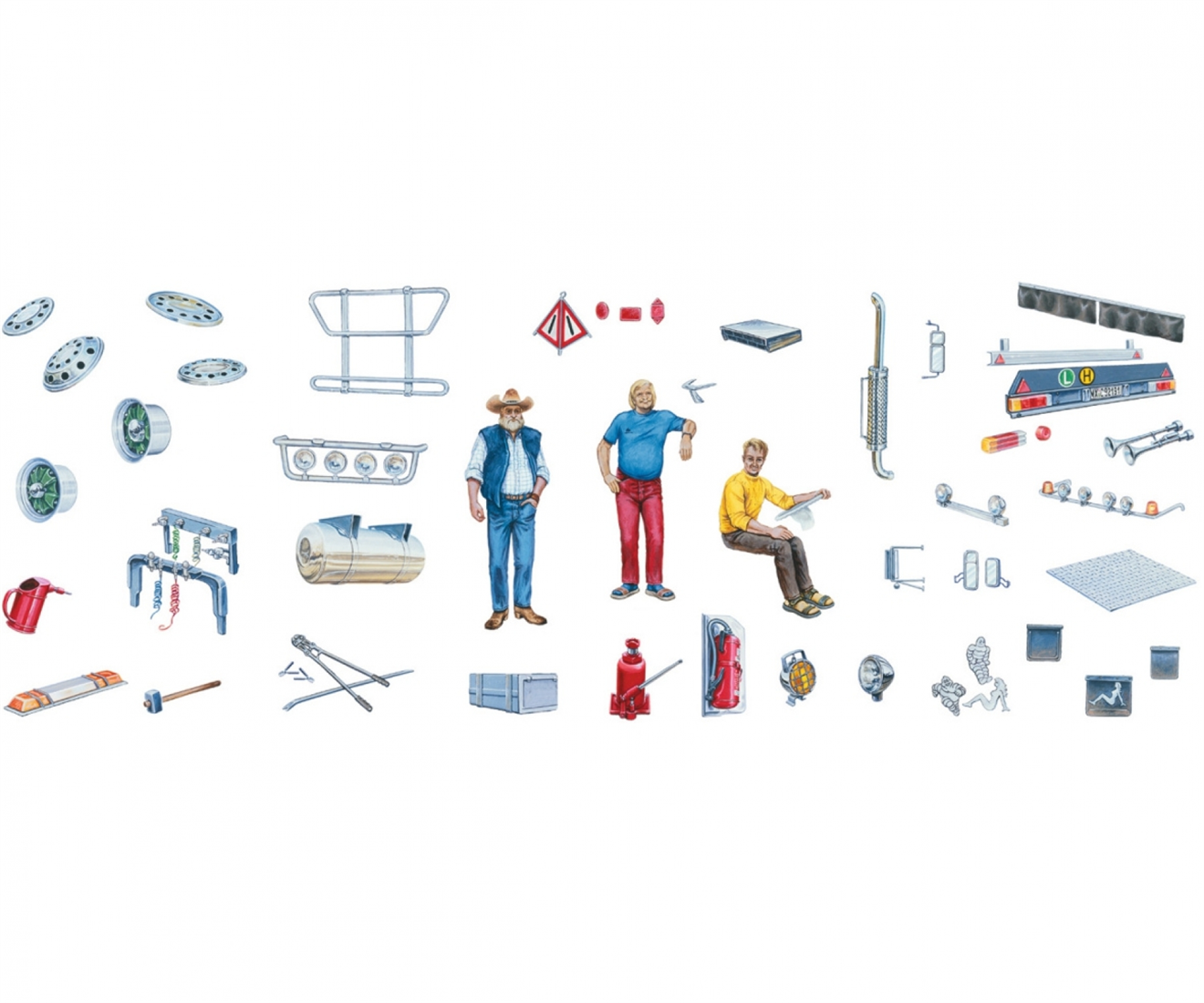 Das Standmodell ist eine Nachempfindung von verschiedenstem Truck Zubehör, welches eine Vielzahl von Truckmodellen vervollständigen und abrunden kann. Hierbei stechen die Figuren in verschiedenen Posen heraus, welche detaillierte Kleidung tragen, als auch das detailreiche Zubehör, welches sich ideal eignet um Dioramen zu vervollständigen.