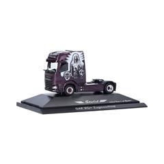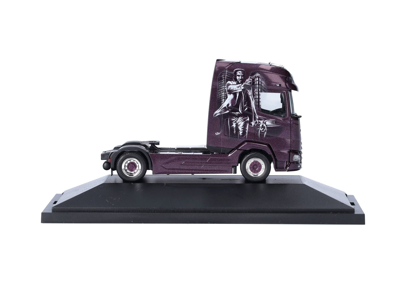 Das Erscheinungsbild ist gut bekannt. Violettmetallic und in der Regel ein weiß-schwarz gehaltenes Airbrush-Motiv, so lässt Alex Stelzl seine Zugmaschinen lackieren. Neu im Fuhrpark sind zwei DAF XG+ Zugmaschinen, diese hier wurde von Walter Rosner lackiert. Die Solozugmaschine erscheint in der Reihe der Vitrinen-Modelle.