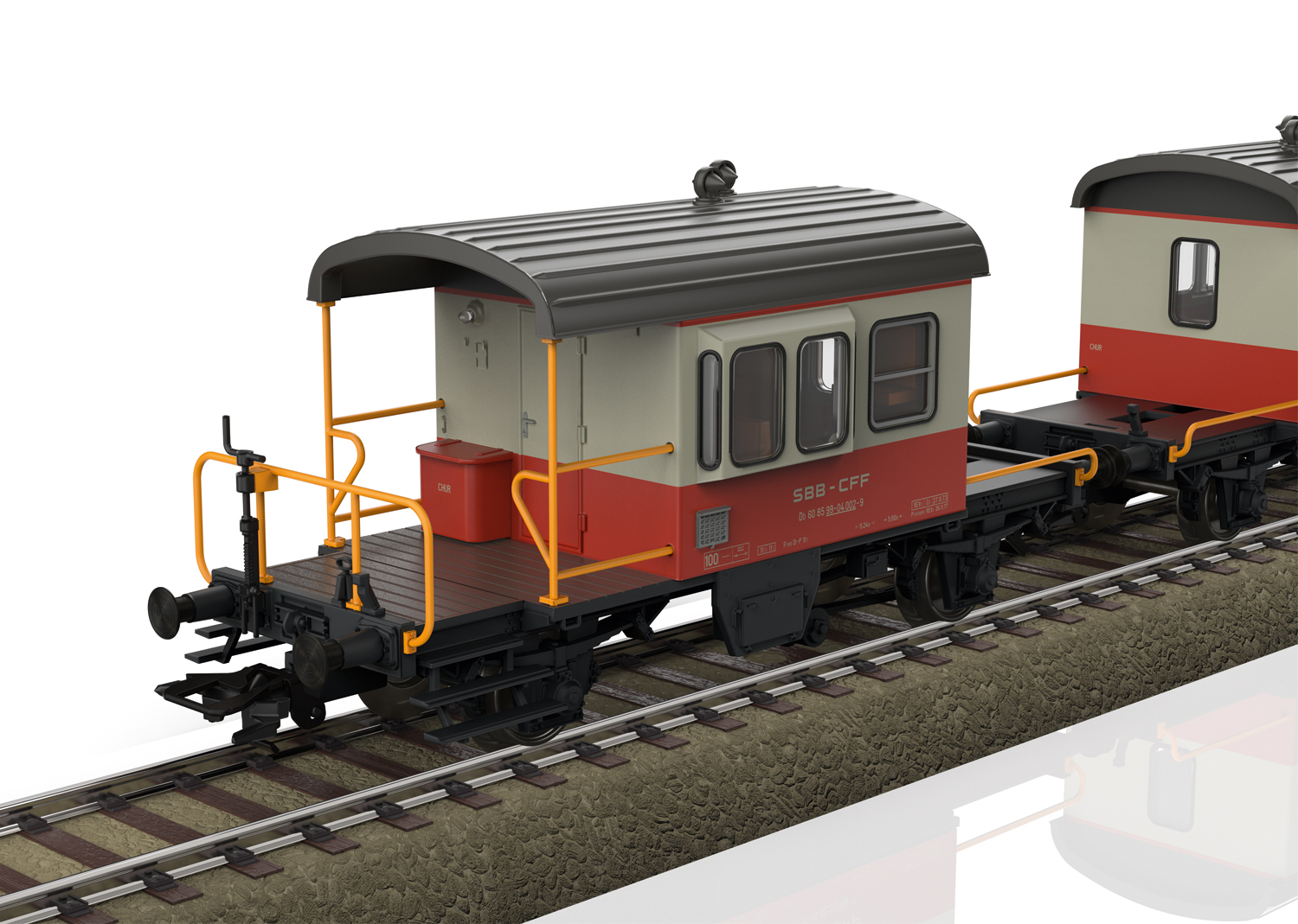 Komplette Neukonstruktion des Dienstbegleitwagen Bauart Db „Sputnik“. Typspezifisch gestalteter Unterboden mit vielen angesetzten Details. Pufferhöhe nach NEM. Separat angesetzte Griffstangen, Handbremskurbel, Gaskasten und Dachlüfter. Mit Inneneinrichtung.