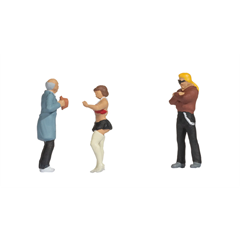 Mit Funny-Scenes “Straßenstrich” bringt NOCH eine gewagte und humorvolle Szene für Ihre Modellbahnanlage! Dieses Set zeigt das Geschehen auf einer Straße bei Nacht: Ein älterer Herr schaut verlegen, während eine selbstbewusste Dame im kurzen Outfit und auffälliger Pose das Gespräch sucht. Neben den beiden steht ein weiterer Mann mit verschränkten Armen und prüfendem Blick, als würde er die Lage genau beobachten.