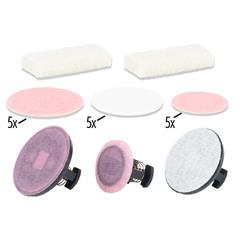 Ersatzteil-Set für den Schienenreinigungswagen in H0. Enthält zwei Filzschwämme, zwei große Reinigungsköpfe, einen kleinen Reinigungskopf sowie jeweils 5 Schleifscheiben groß und klein und 5 Reinigungstücher.