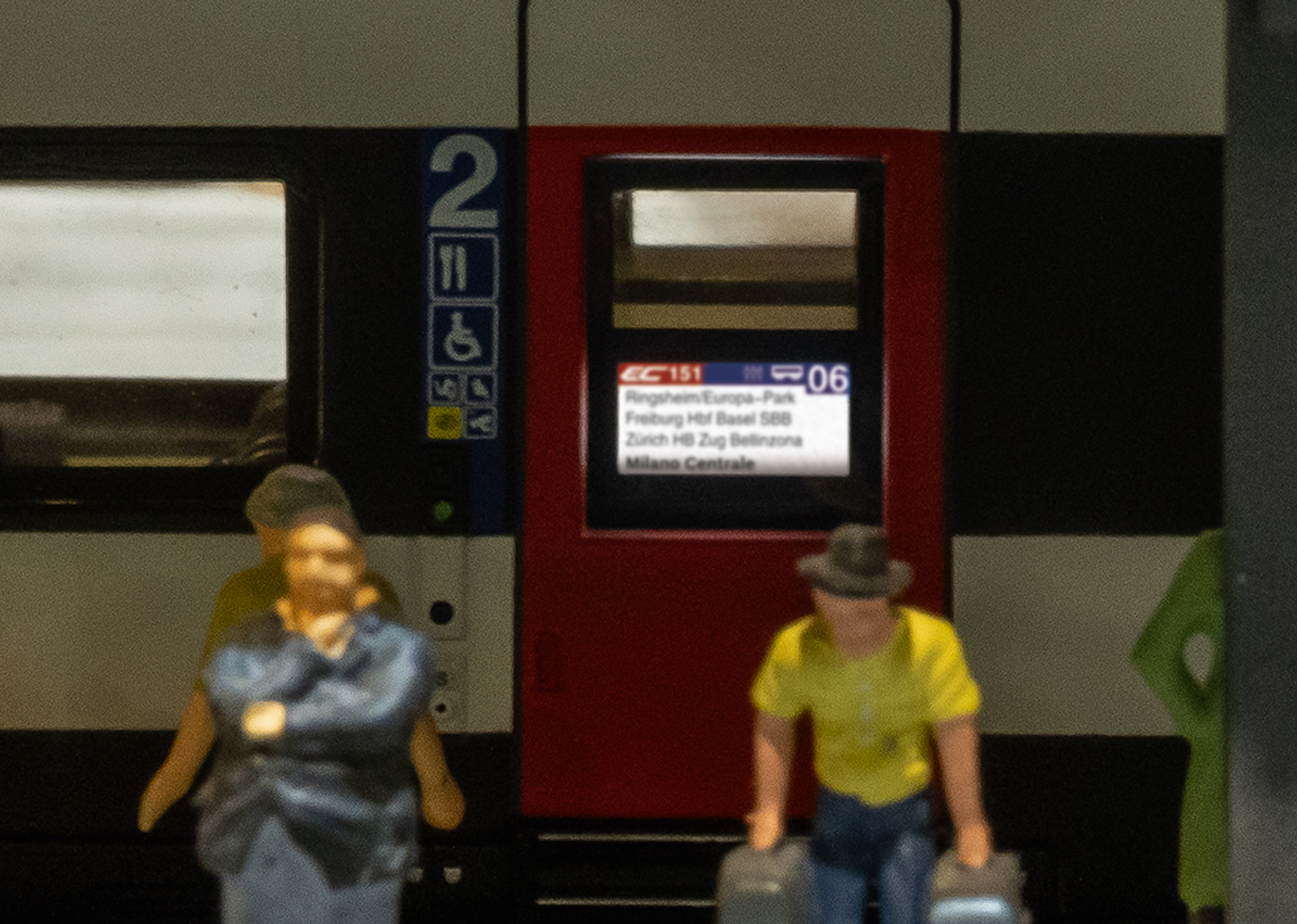 - Beleuchtete Zugziel-Anzeigen in den Türen erlöschen nach Anfahrt des Zuges.