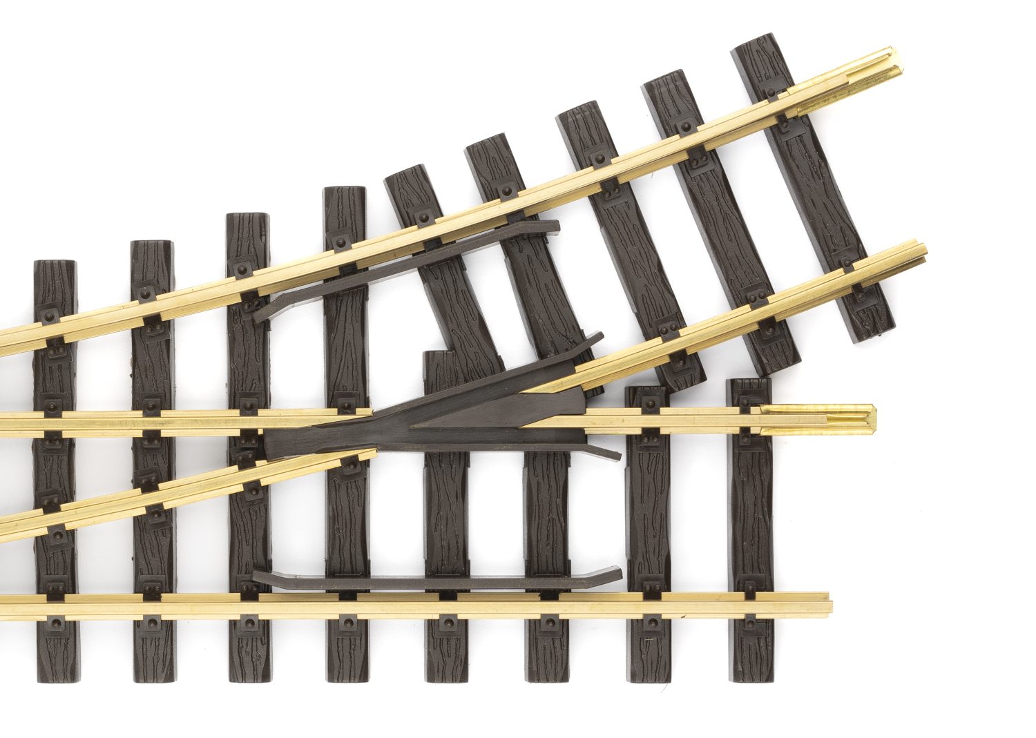 Gerades Gleis: 440 mm. Abzweigendes Gleis: links, R3, 22,5°. Der elektrische Weichenantrieb (LGB 12010) lässt sich links oder rechts an der Weiche montieren. Die Schaltung kann mit dem LGB Stellpult (LGB 51755) o.ä. erfolgen.