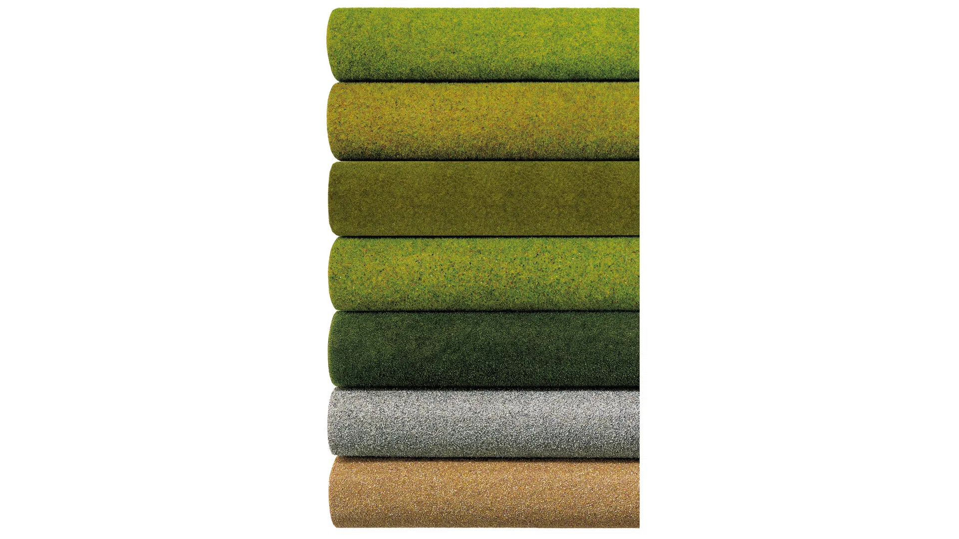 Ein strapazierfähiges Spezialpapier dicht mit Grasfasern beflockt. Die darin aufrecht stehenden Grasfasern ergeben ein naturgetreues Mattenbild.