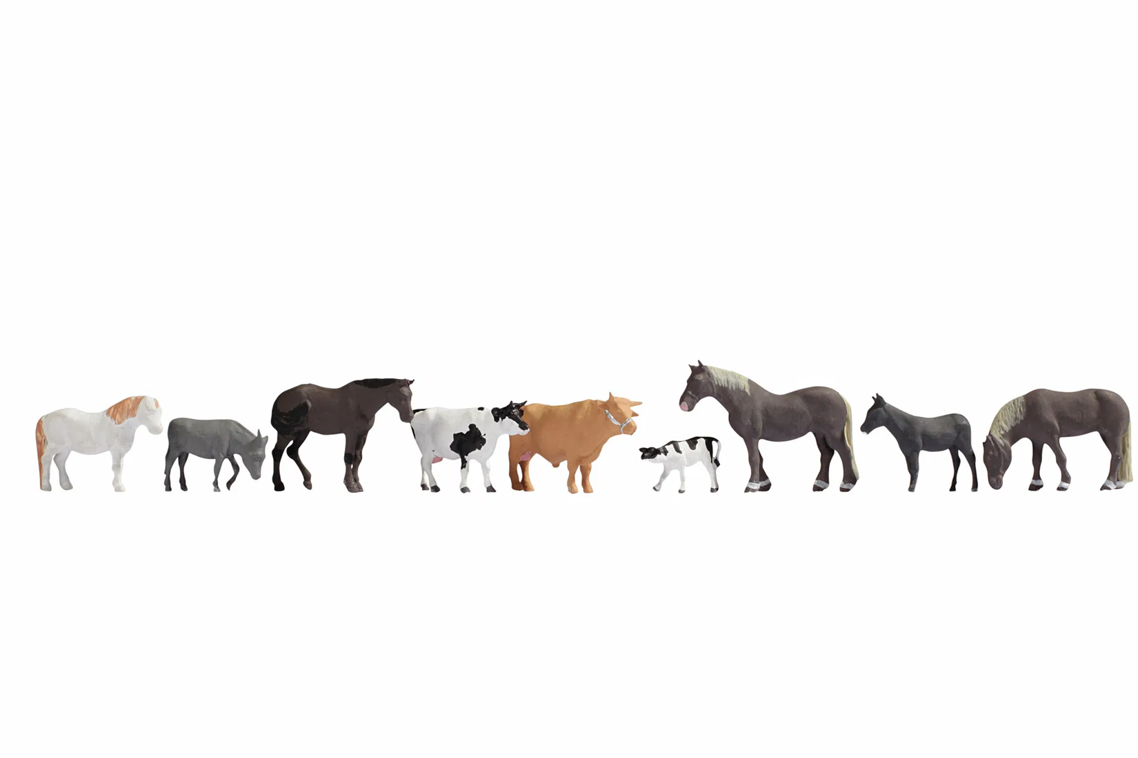 Dazu gehören drei braune Pferde, ein weißes Pferd und ein graues Fohlen sowie ein grauer Esel. Auch enthalten sind eine schwarz-weiß gefleckte Kuh, eine braune Kuh und ein schwarz-weiß geflecktes Kälbchen.