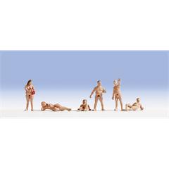Das Set für die Spur H0 (Massstab 1:87, ca. 2 cm hoch) enthält drei weibliche und drei männliche FKK Badende in einer ruhigen Badeatmosphäre. Alle Figuren sind in verschiedene liegenden oder stehenden Posen dargestellt: Eine Frau, die entspannt auf der Seite liegt, sowie einen Mann, der Bier aus einer Dose trinkt und einen weiteren, der freundlich winkt. Mit diesen detailliert gestalteten Figuren lassen sich realistische Strand- oder Badesequenzen für Dioramen oder Modellbahnlandschaften ideal nachstellen.