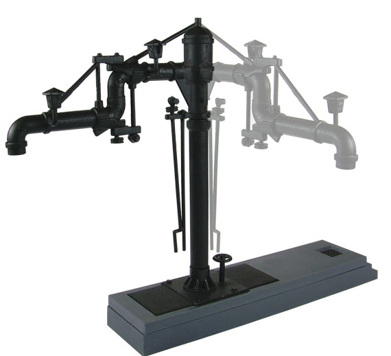 Funktionsmodell. Wasserkran mit schwenkbarem Wasserrohr. Der maximale Drehwinkel beträgt 90°. Die Schwenkweite ist innerhalb dieses Winkels frei steuerbar.