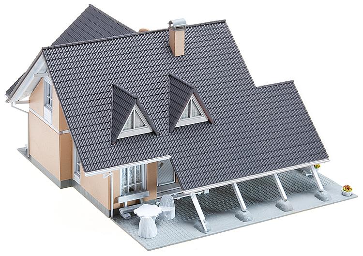 Einfamilienhaus mit Wintergarten und tief heruntergezogenem Dachunterstand für den Carport.