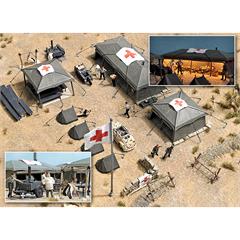 Mit dem Inhalt dieses Bausatzes kann ein komplettes Feldlazarett aufgebaut werden. Mit großem Zelt als Krankenlager, einem Behandlungszelt, einem Verpflegungszelt sowie vier Zweimannzelten (»Dackelgarage«) zum Übernachten. Weiterhin enthalten: Feldbetten aus echtem Holz, Tische und Sitzgarnituren, Trage, Sandsäcke, Stacheldrahtumzäunung, Holzabsperrungen (»Spanische Reiter«), Fahnenmast mit Fahne und Feldküche mit Sandblechen. Passende Ergänzung: VW Passat Variant Sanitätsfahrzeug Nr. 5621.
