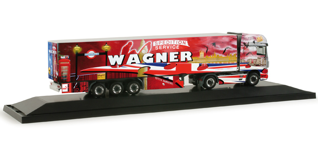 Das Leistungsspektrum der seit 40 Jahren tätigen Spedition geht vom kleinen Kurier- oder Begleitfahrzeug über 7,5tonner bis hin zu 40t-Tonnen-Sattelzügen, Autotransportern und Tiefladespezialfahrzeugen. Mit zwei Standorten in Deutschland (Amberg und Berlin), sowie weiteren Standorten in England und Italien transportiert das Unternehmen Frachten weit über die europäischen Grenzen hinaus. Das Modell, dessen farbenprächtiges Vorbild vom Airbrusher Rüdiger Fieber aus Amberg gestaltet wurde, erscheint als Truckhighlight in PC-Vitrine. Fahrer- und Beifahrerfigur gehören zur Ausstattung des Modells dazu.