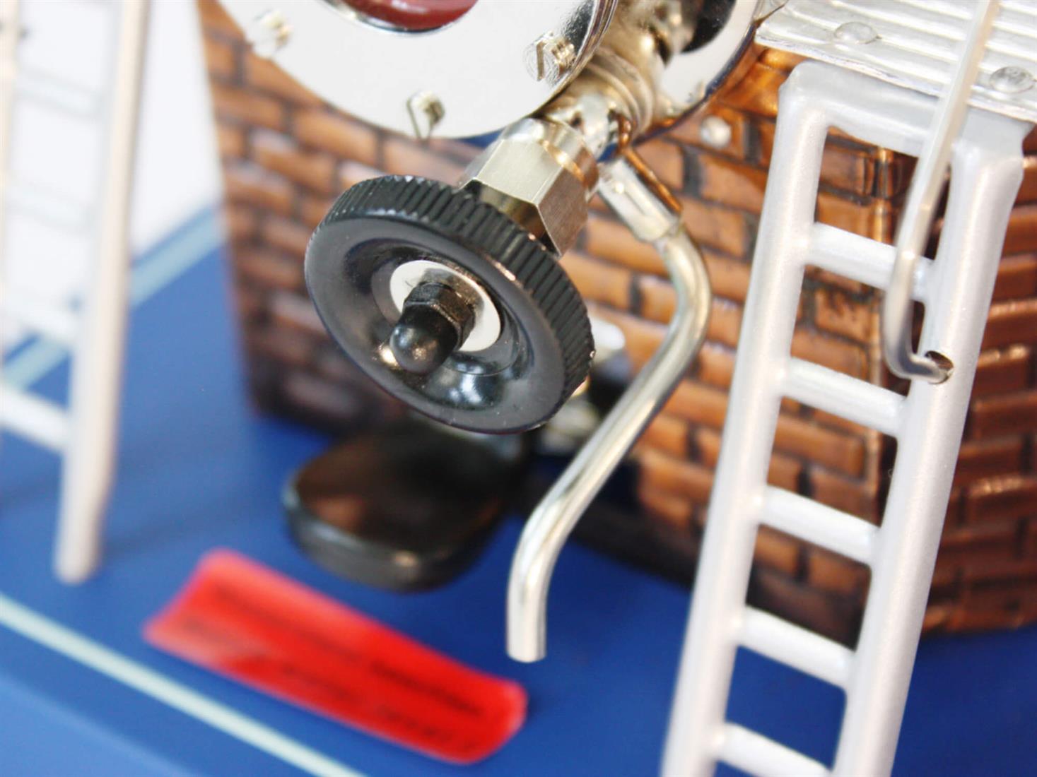 Diese stationäre Dampfmaschine ist die meist hergestellte Maschine des WlLESCO-Sortiments. Der Kessel von 6,5 x 16,5 cm hat ein Volumen von 500 ccm. Über das Manometer ist der Dampfdruck ständig kontrollierbar und mit dem Ablasshahn läßt sich nach dem Betriebsende verbliebenes Restwasser aus dem Kessel entfernen.