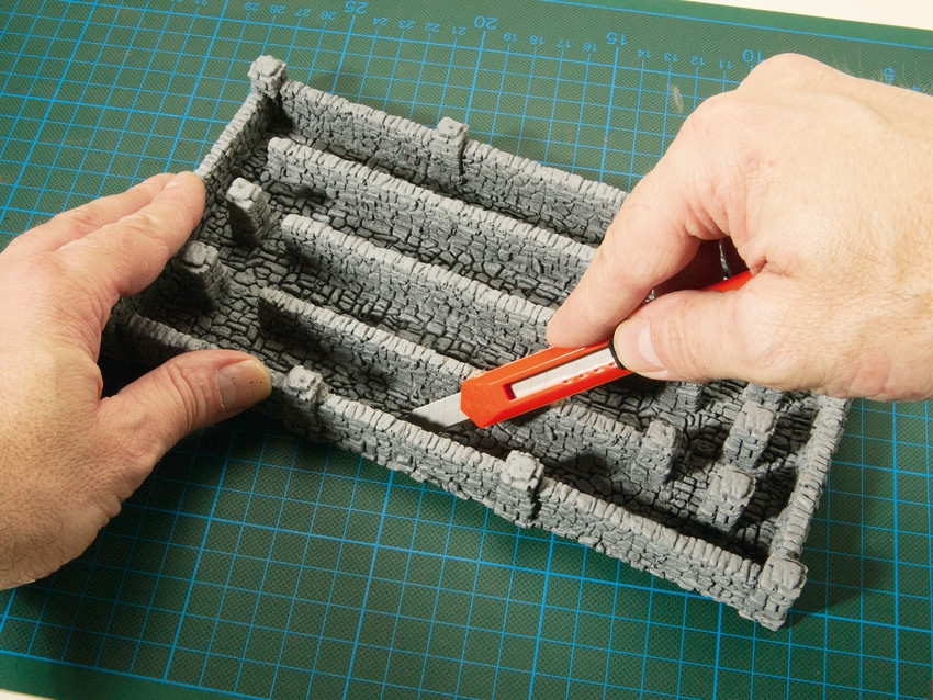 1. Die Mauern werden mit dem Cuttermesse von der Grundplatte getrennt. Die übrigen Mauerreste können zusammen geklebt werden und für weiter Mauern verwendet werden.