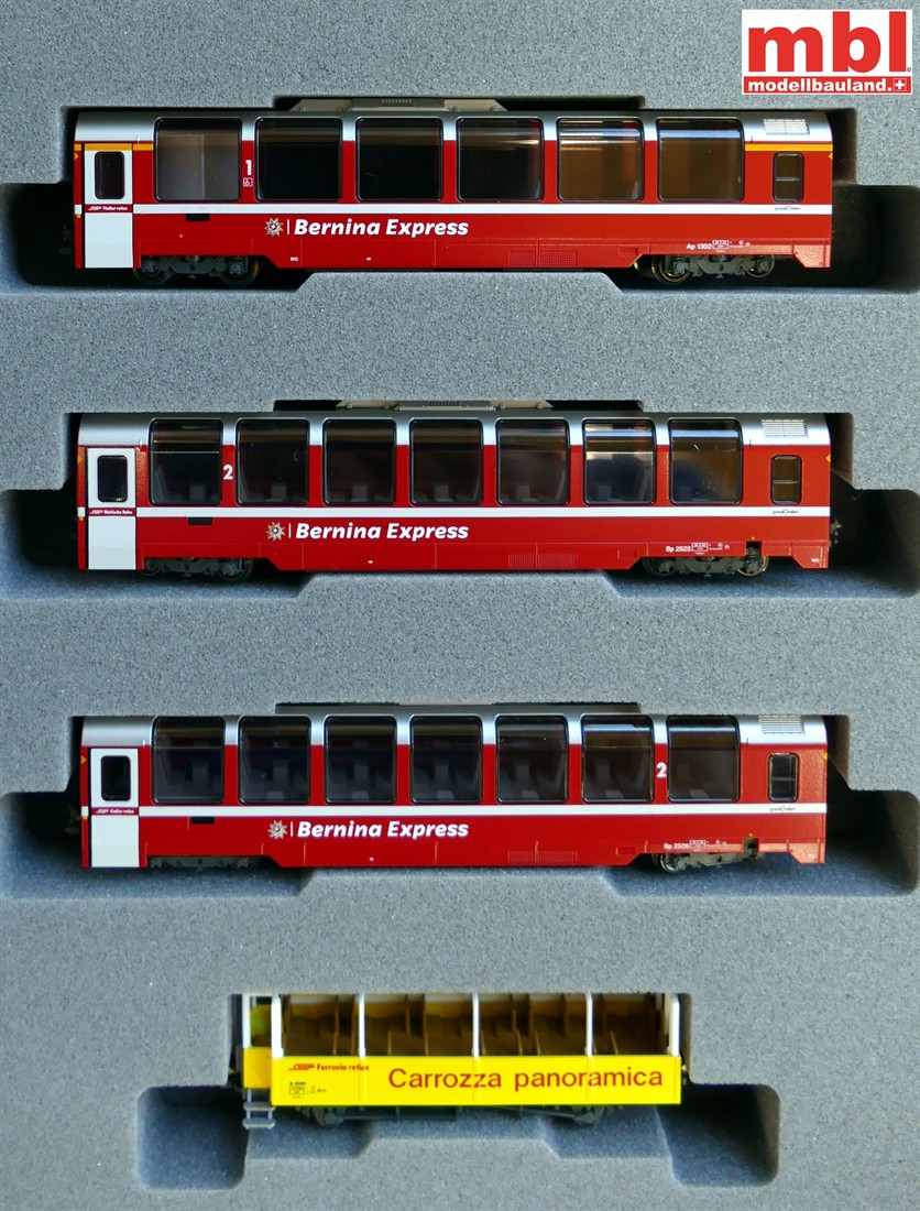 Bernina-Express 4-teiliges Wagenset, 3 Personenwagen und 1 Aussichtswagen