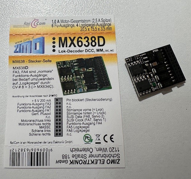 ZIMO MX638D H0 Decoder, 1,0 A, 6 Fu-Ausgänge, 21pol. mtc