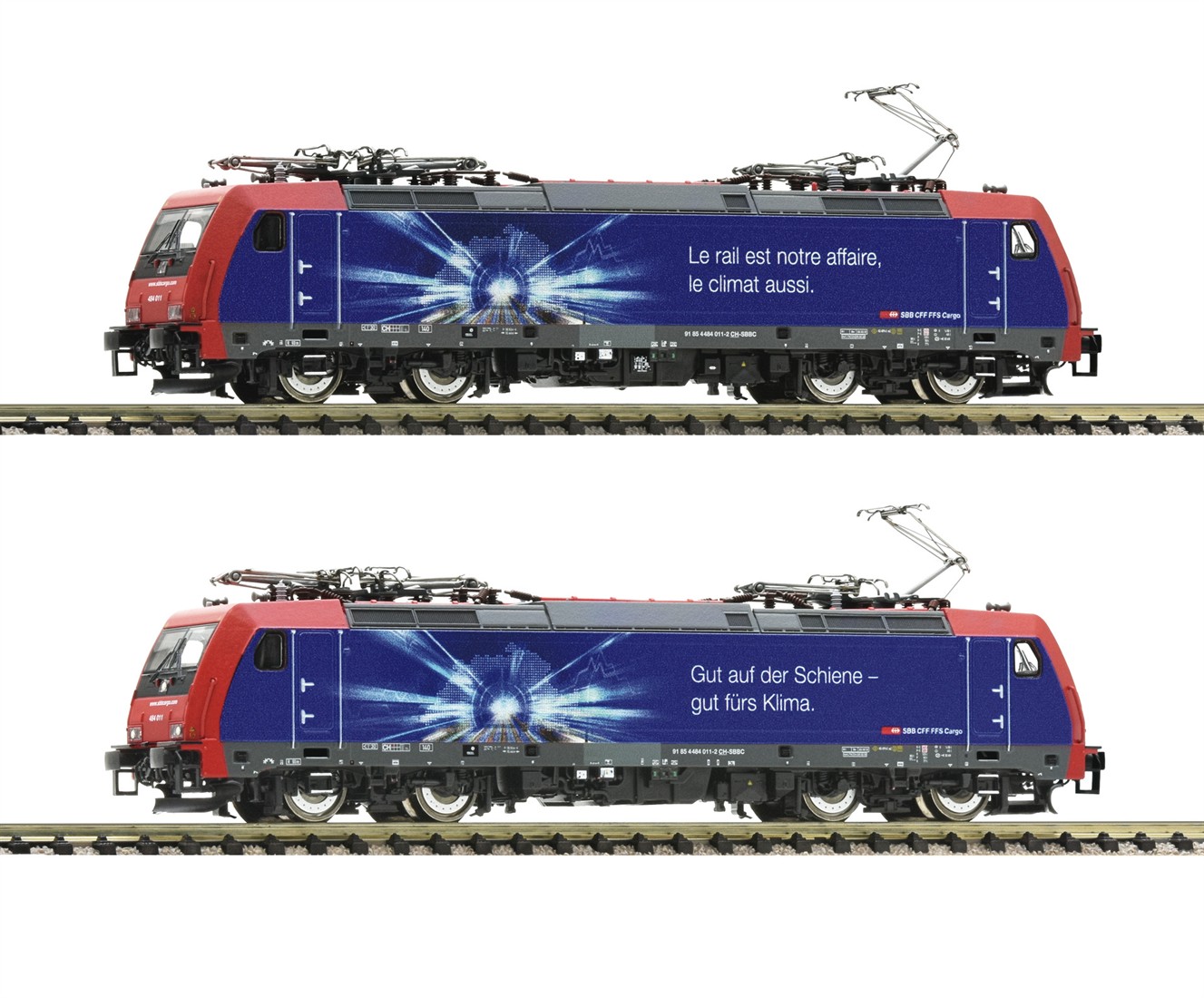 Mit dem Statement „Gut auf der Schiene – gut fürs Klima“ rollte die Re 484 011 im Oktober 2021 aus der Werkstatt. Die Botschaft ist auf der gegenüberliegenden Seite in französischer Sprache angebracht. Die Abbildung symbolisiert, mit der Schweizer Karte und den mitten hindurch fahrenden Schienengüterverkehr, den stark steigenden Transport durch die Schweiz.