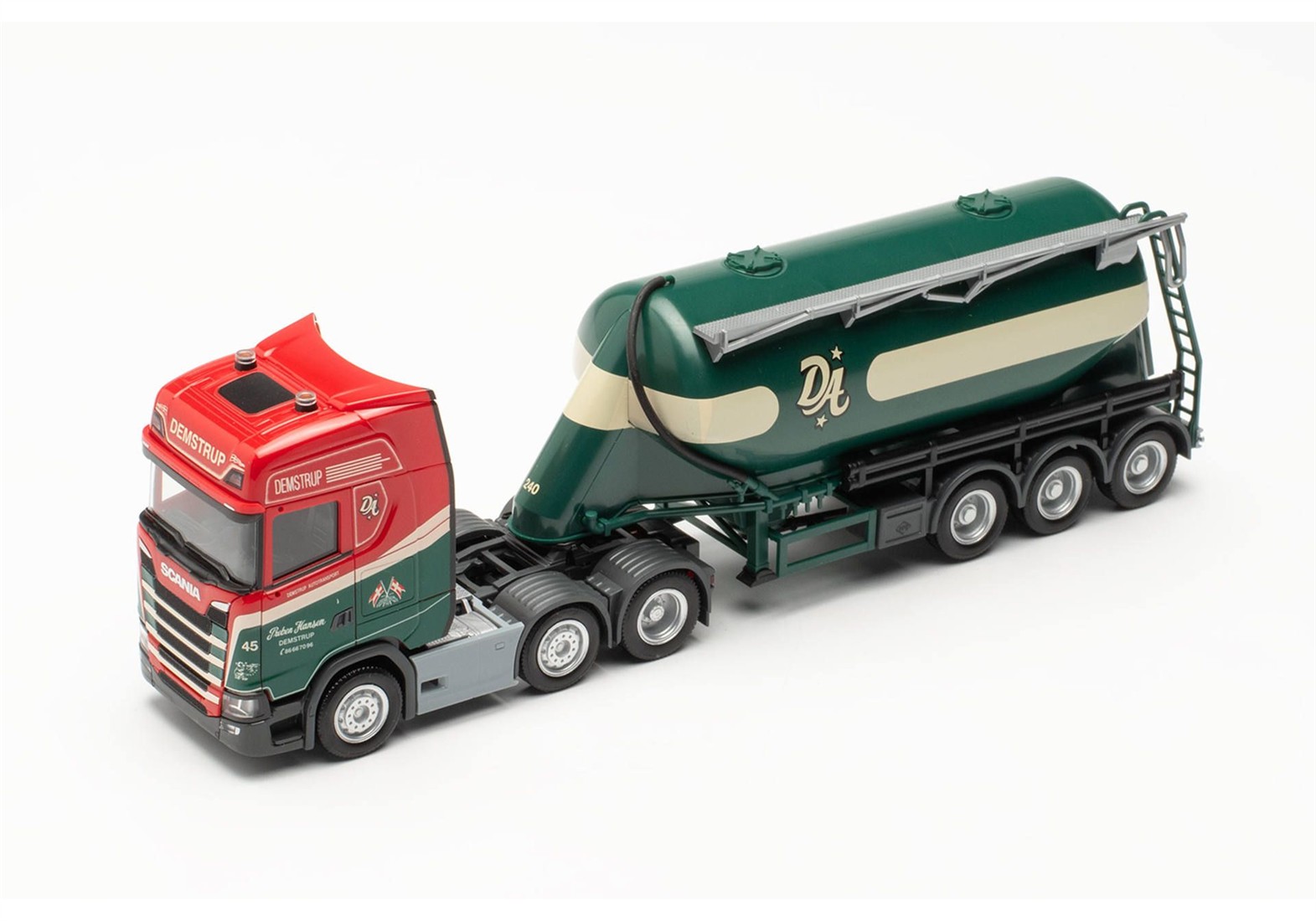 Unter dem Namen Preben Hansen erschien bereits vor mehr als zehn Jahren ein Silosattelzug mit MAN als Zugmaschine. Demstrup Autotransport ist seit über 45 Jahren mit Silozügen im Geschäft und karrt Ware (Pulver oder Granulat) durch Dänemark mit über 70 Sattelzugmaschinen. Hier wird ein Scania CS 20HD Eutersilosattelzug in limitierter Auflage umgesetzt.