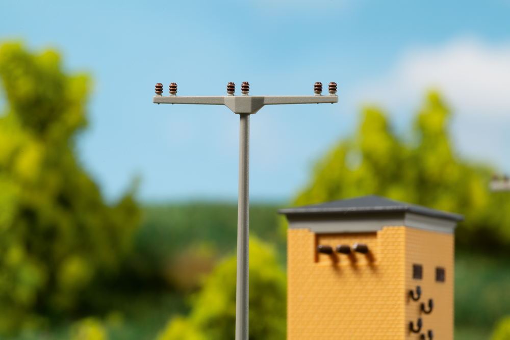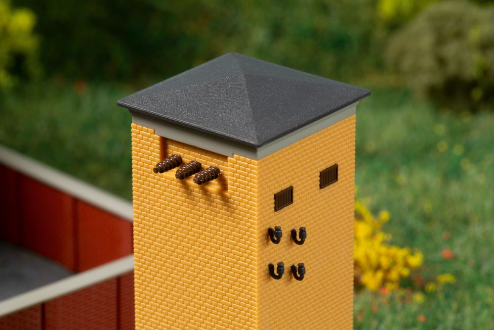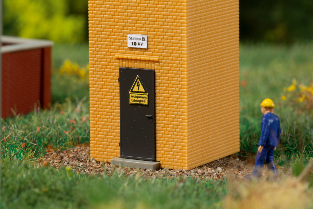 In landschaftstypischer Klinkerbauweise ist dieses Gebäude der Energieversorgung errichtet worden. Beim Vorbild im Inneren mit einem Transformator ausgeru¨stet, dienten diese Anlagen zur Umwandlung der 10 kV des Mittelspannungsnetzes auf den Spannungswert von 230/400 V des Ortsnetzes. Der durch Raumzellenbauweise einfach zu montierende Bausatz wird durch 9 Mittelspannungsmasten Höhe 64 mm ergänzt. Originalmodell.