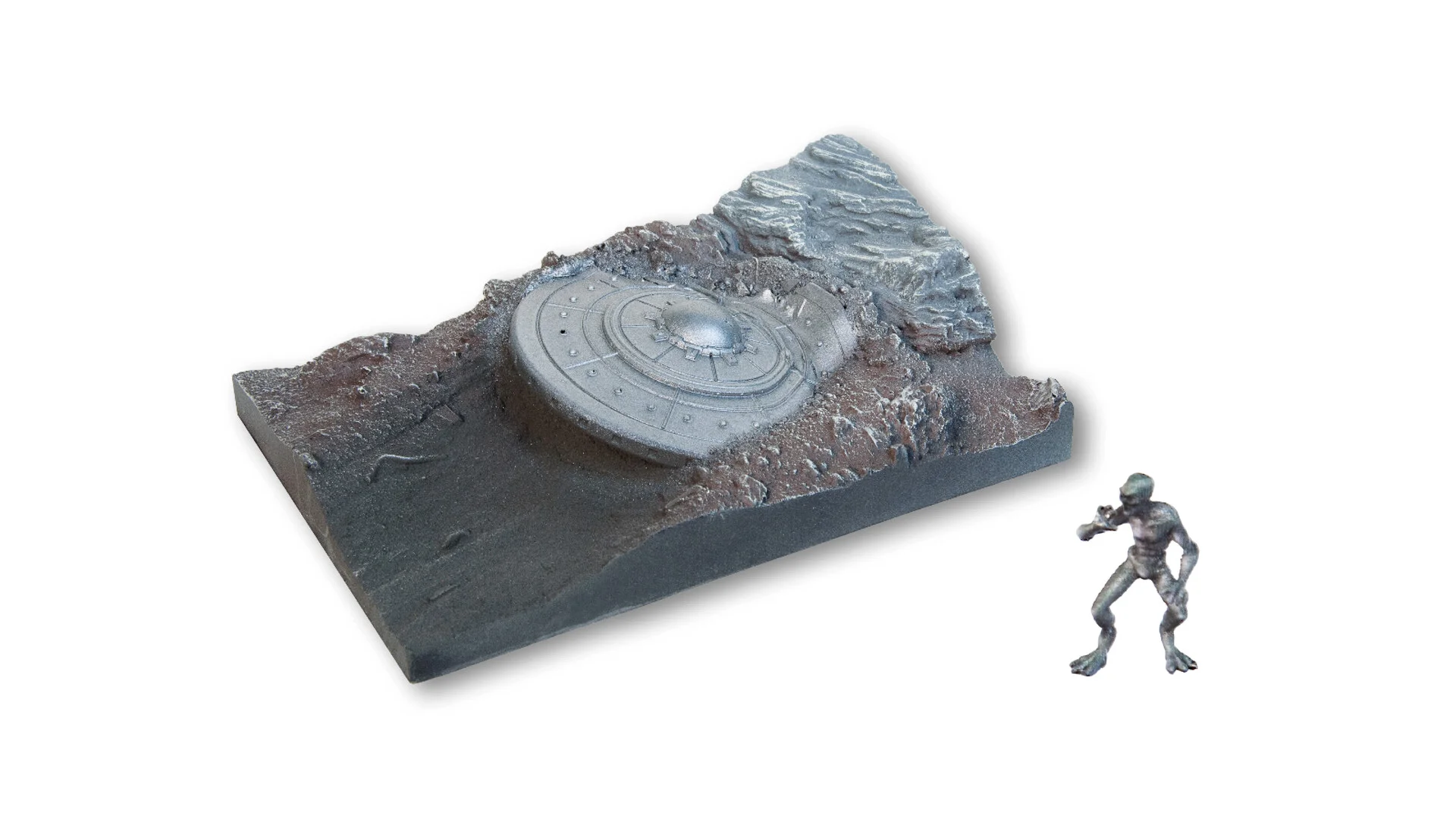 1 Grundplatte mit abgestütztem UFO aus NOCH Hartschaum, handkoloriert, 22,5 x 15 cm, 6,5 cm hoch, eine 3D-gedruckte Alien-Figur, 1,7 cm groß.
