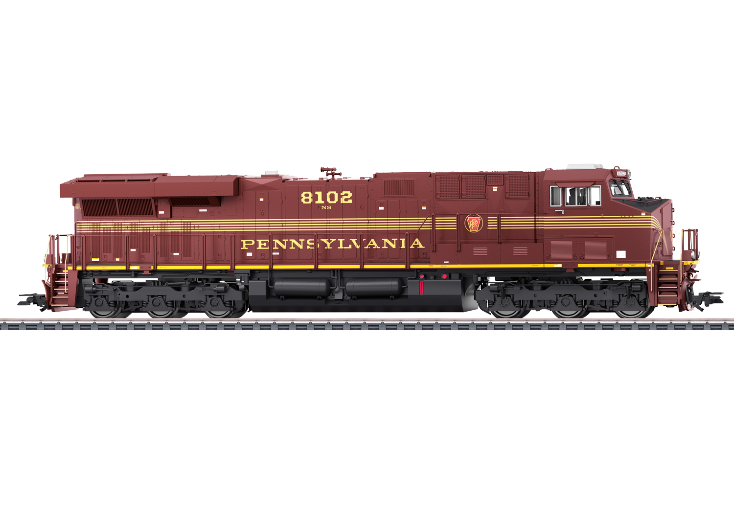 Schwere dieselelektrische Güterzuglokomotive Typ General Electric ES44AC der Norfolk Southern (NS). Grundfarbgebung in Tuscan Red der ehemaligen Pennsylvania RR. Betriebsnummer 8102. Aktueller Betriebszustand als Heritage-Lokomotive.