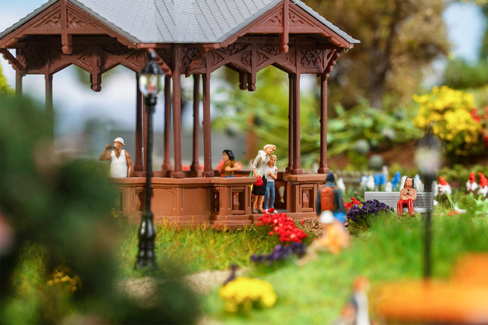 Sanfte Melodien schweben durch den Park und erfüllen die Luft. Sie dringen aus dem kleinen hölzernen Musikpavillon mit seinem steinernen Boden und den kunstvollen Verzierungen. Dieses Modell eignet sich hervorragend, um sowohl modernen als auch historischen Dioramen einen Hauch von verträumtem Charme zu verleihen.