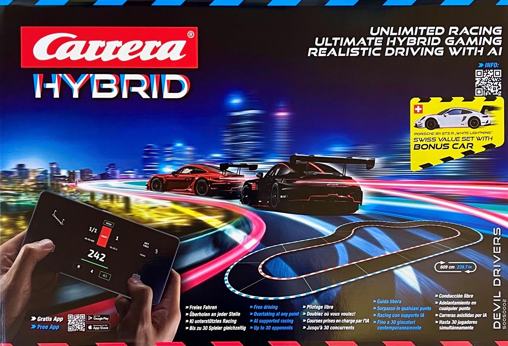 Carrera Hybrid – die perfekte Kombination aus Gaming und Rennspaß, denn die Fahrzeuge können vollkommen frei mit Vollgas über die Fahrbahn düsen. Die KI-Unterstützung ermöglicht ein realistisches Fahrerlebnis in verschiedenen Fahrmodi. Erlebe originalgetreue Fahrzeuge mit Front- und Rücklicht, gesteuert per kostenloser App. Mit automatischer Streckenerkennung, individuellen Einstellungen und authentischem Motorengeräusch bietet Carrera Hybrid ein einzigartiges Rennerlebnis. Entdecke zudem neue Fahrzeuge für noch mehr Rennaction!