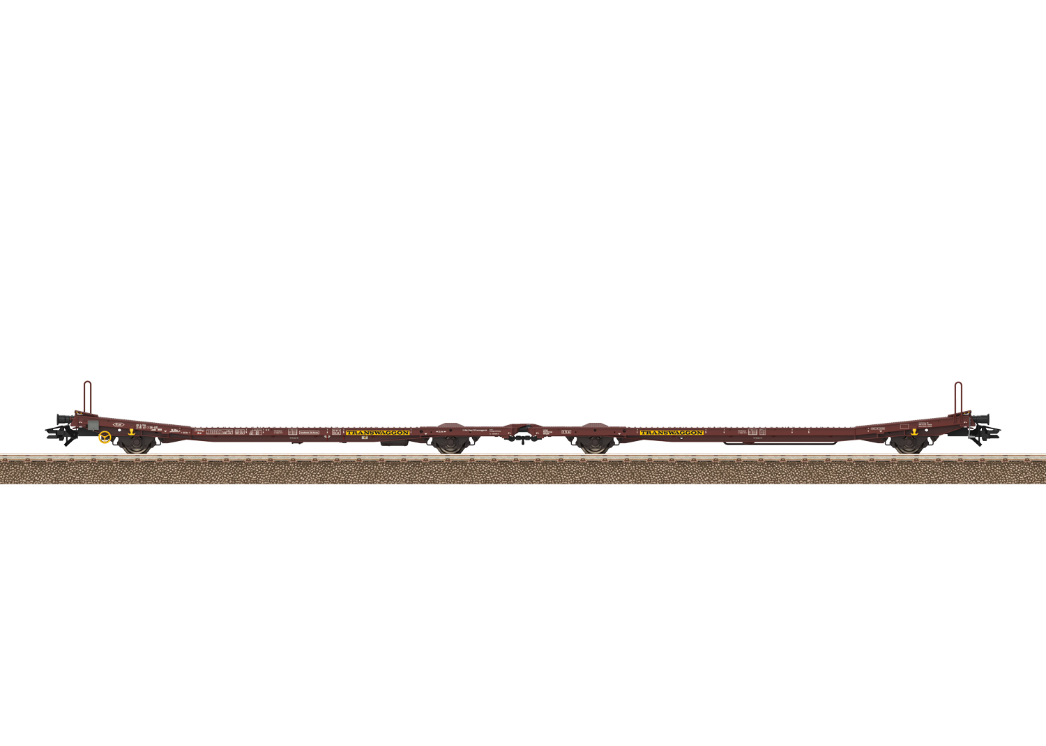 Beide Flachwagenhälften aus Metall. Viele separat angesetzte Details wie Bremsleitungen, Luftbehälter, Überfahrbleche, Tritte und Bremsgestänge. Pufferhöhe nach NEM. Kinematikgeführte, starre Schraubenkupplung zwischen den Wagenhälften. Haltekeile für die Wagenoberseite, Haltekeile für den Wagenboden und Bremsschläuche liegen als separat ansteckbare Teile bei. Beladen mit vier VW Crafter von der Firma Schuco. Länge über Puffer 32,4 cm. Wechselstromradsatz E413993.
