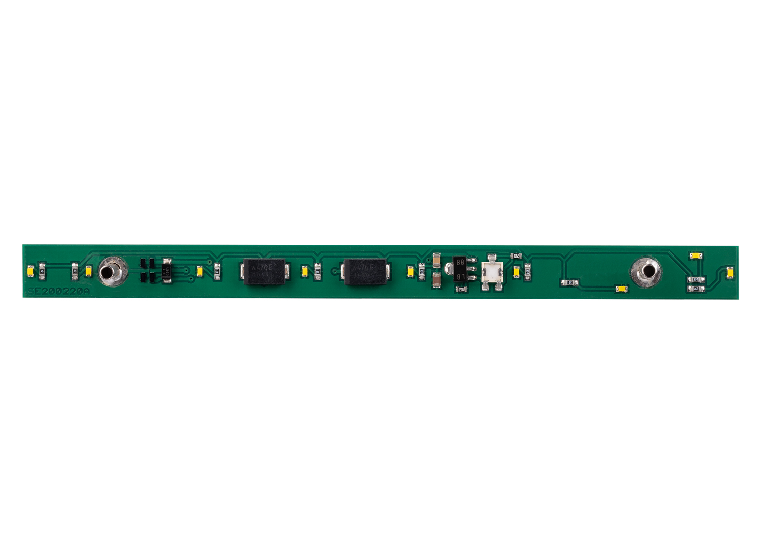 Für Minitrix Personenwagen mit einer Länge über Puffer von 165 mm (Ausnahme sind Personenwagen auf Basis der Silberlinge) und mit Stromaufnahme von jeweils einem Leiter je Drehgestell. Mit Anschlußbuchse für Personenwagen mit beleuchtetem Zugschlusssignal ab dem Produktionsjahr 2025. Bestehend aus einer LED-Lichtleiste (warmweiß) und Schleiferfedern. Die LED-Lichtleiste ist mit einem Elko zur Energiepufferung (Flackerschutz) und einem Dimmer (Poti) ausgestattet.