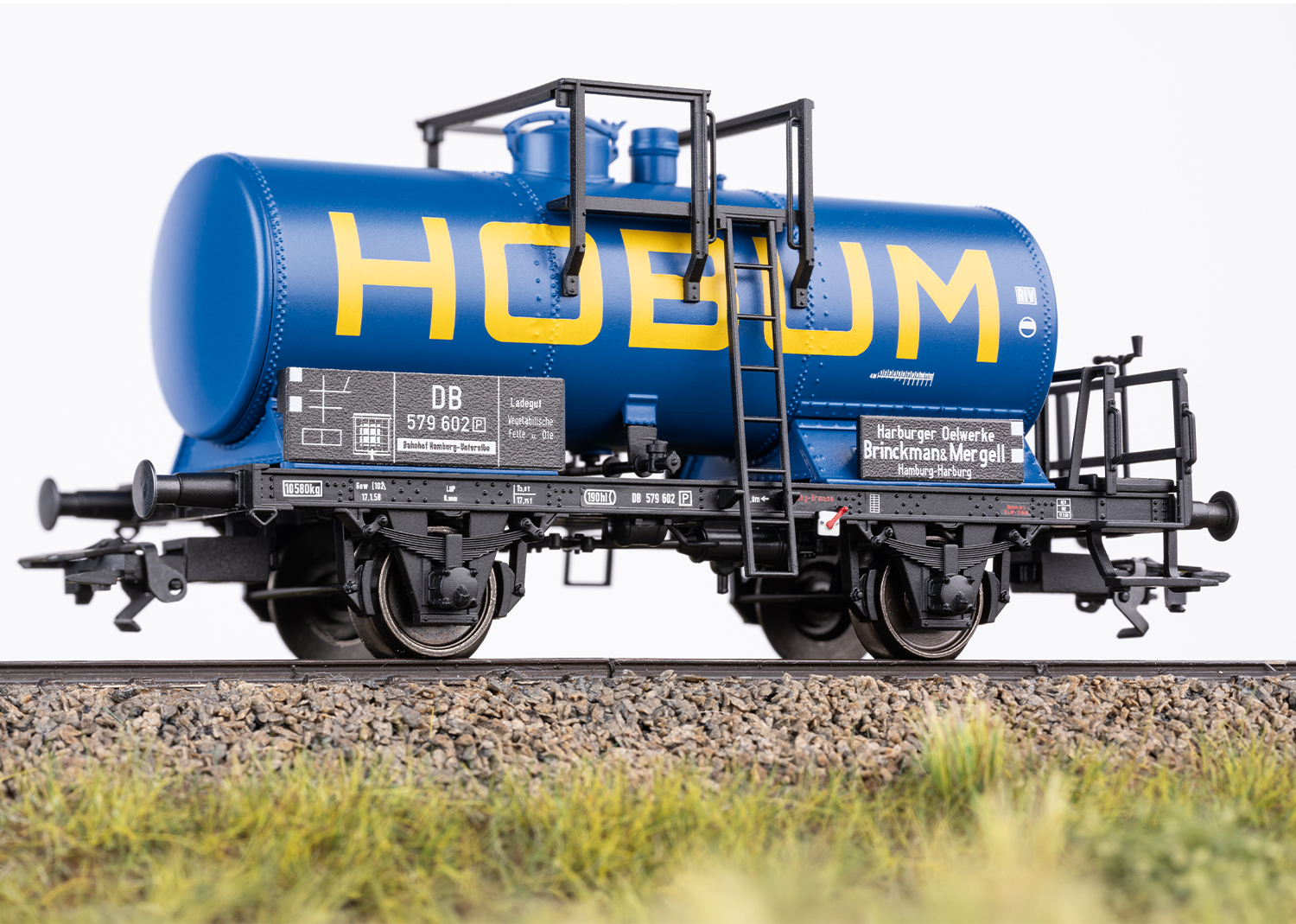 Kesselwagen mit zwei Radsätzen in detaillierter Ausführung mit unterschiedlichen Betriebsnummern, Beheimatungen und Eigentümern. Acht Wagen mit Handbremse und Bremserbühne ohne Bremserhaus und vier Wagen mit Handbremse und Bremserbühne mit Bremserhaus. Detailliertes Fahrgestell mit durchbrochenem Rahmen. Detailliert nachgebildete und separat angesetzte Handbremskurbel, Bremsanlage und Entleerungsrohre. Angesetzte Arbeitsbühne mit Aufstieg. Angesetzte Bremserbühne, ohne und mit angesetztem Bremserhaus. Mit kulissengeführten Kurz-Kupplungen. Jeder Wagen in gekennzeichnetem Karton einzeln verpackt.